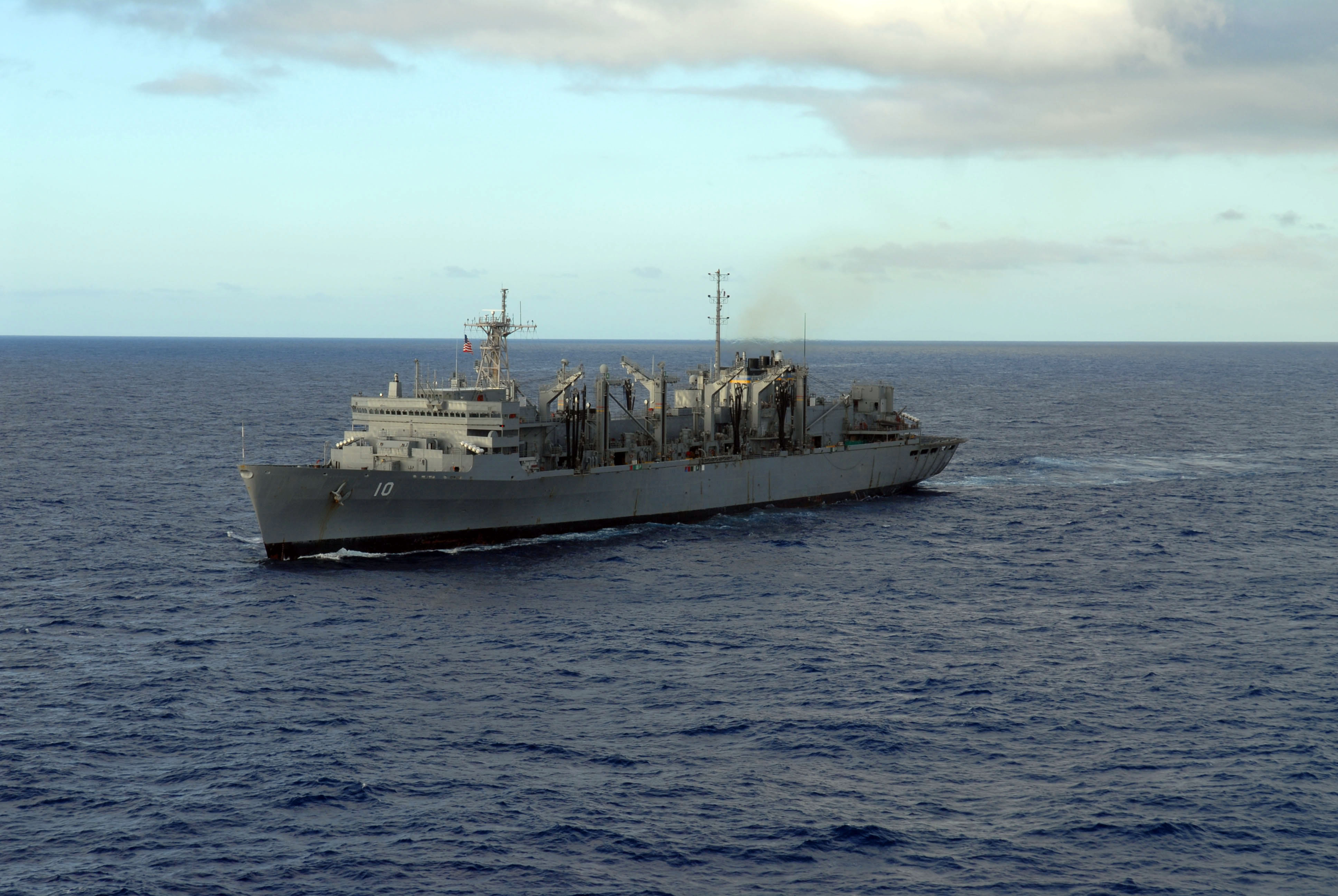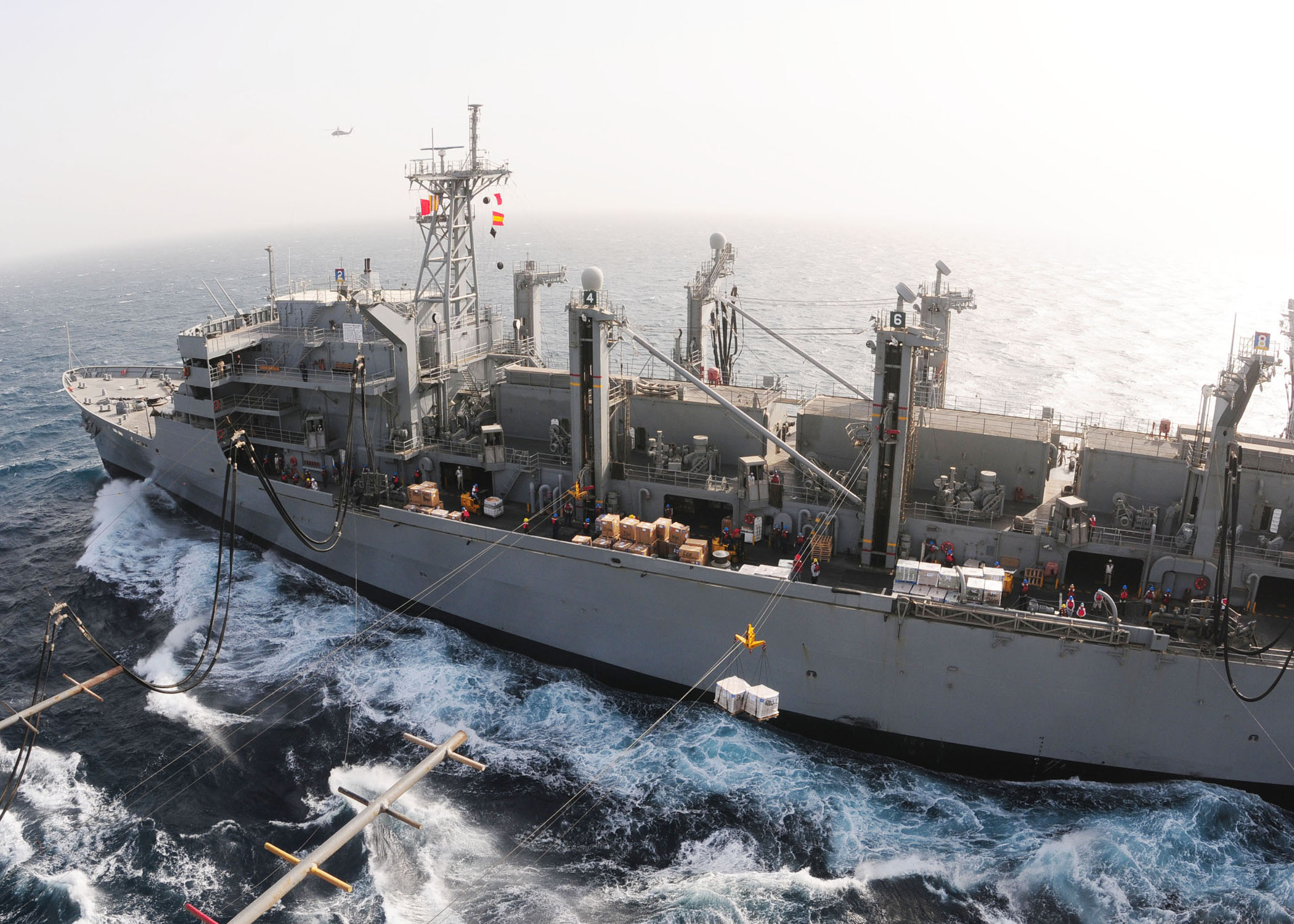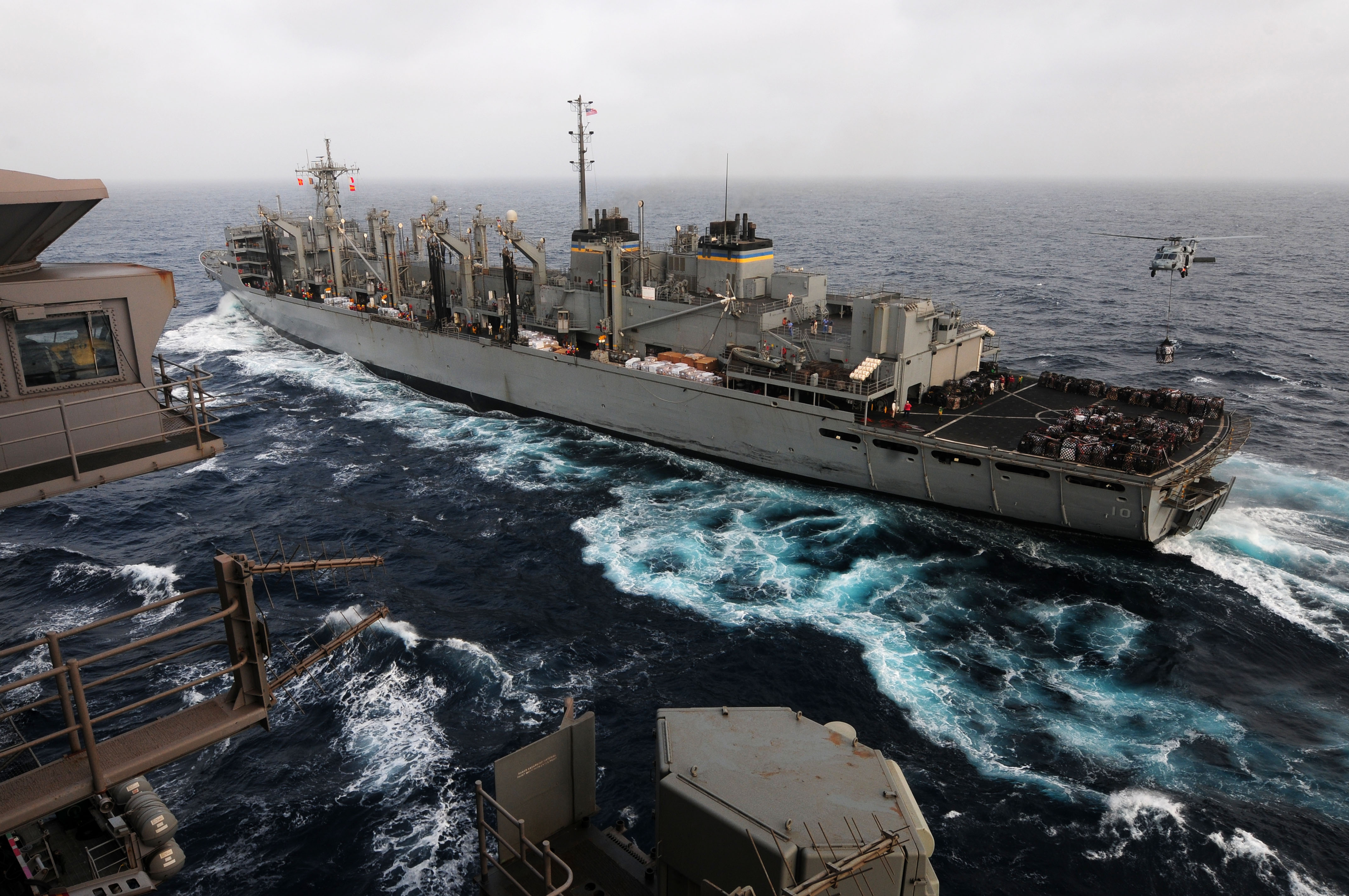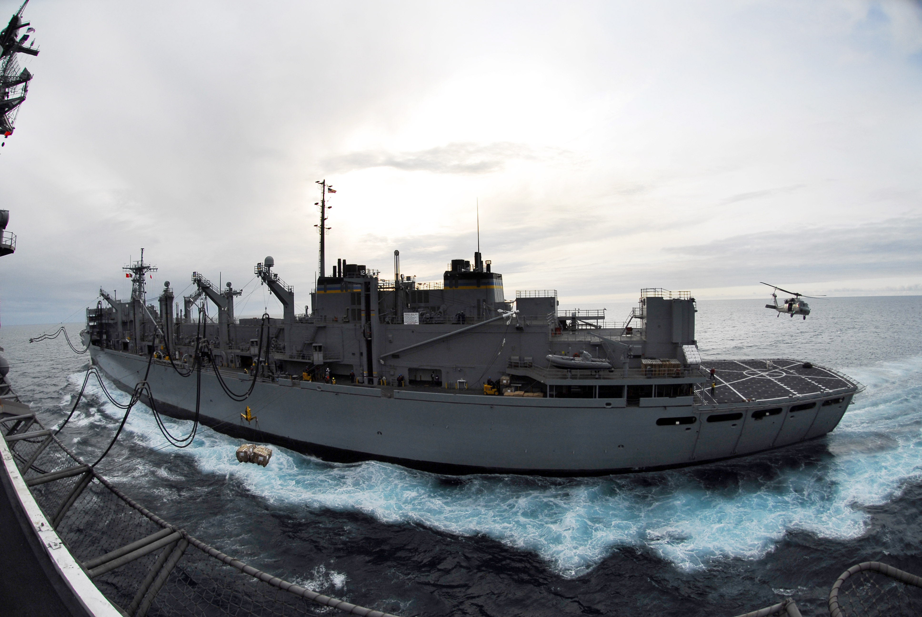 | 930k | USNS Bridge (T-AOE 10) conducts an underway replenishment at sea with the nuclear aircraft carrier USS Nimitz (CVN-68) (not shown) and the guided missile cruiser USS Vicksburg (CG-69). The Nimitz Carrier Strike Group is on a routine deployment to the U.S. 5th Fleet area of responsibility US Navy photo # 091001-N-3038W-310 INDIAN OCEAN (Oct. 1, 2009) by MC3 John Philip Wagner Jr. |