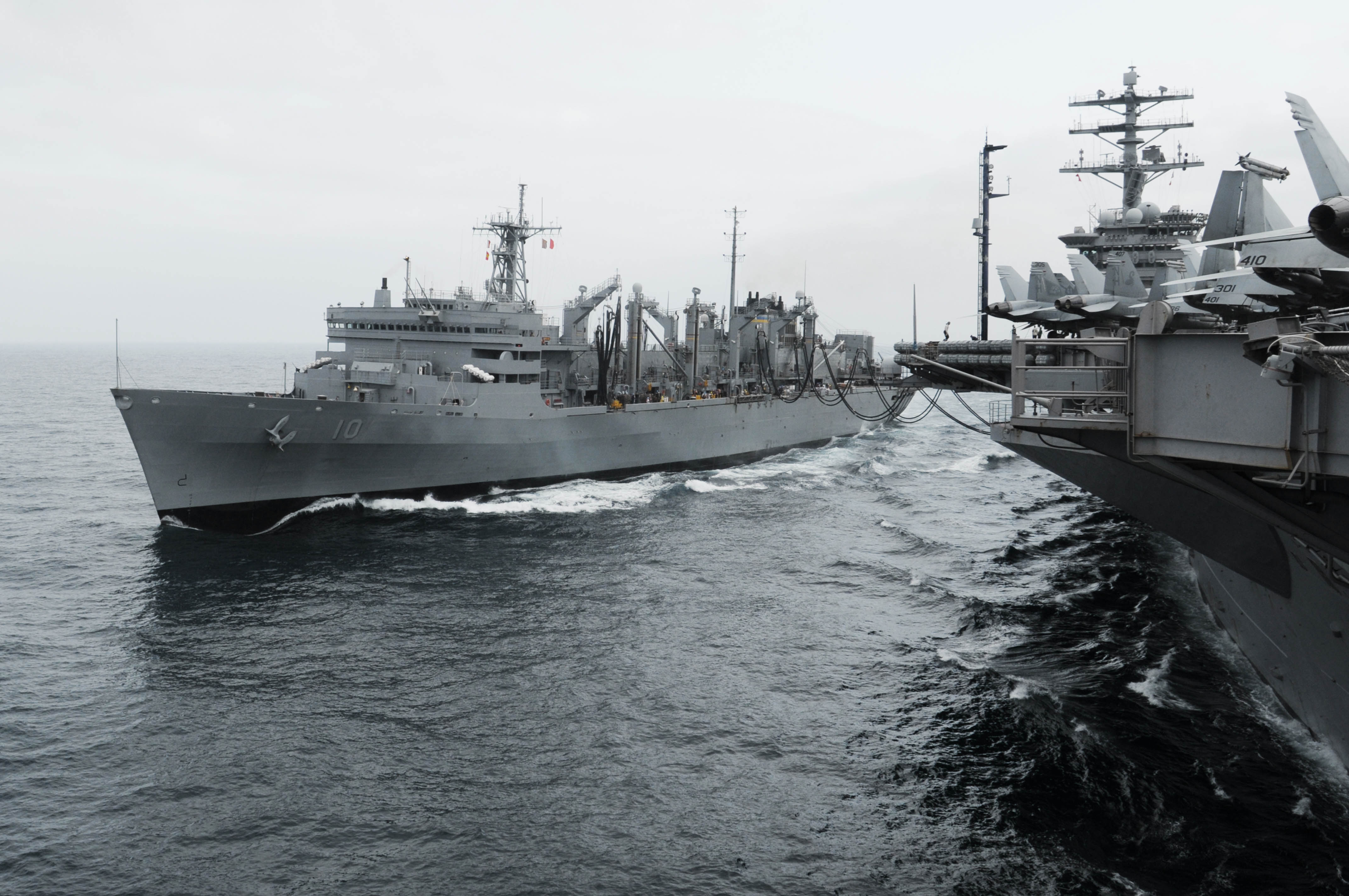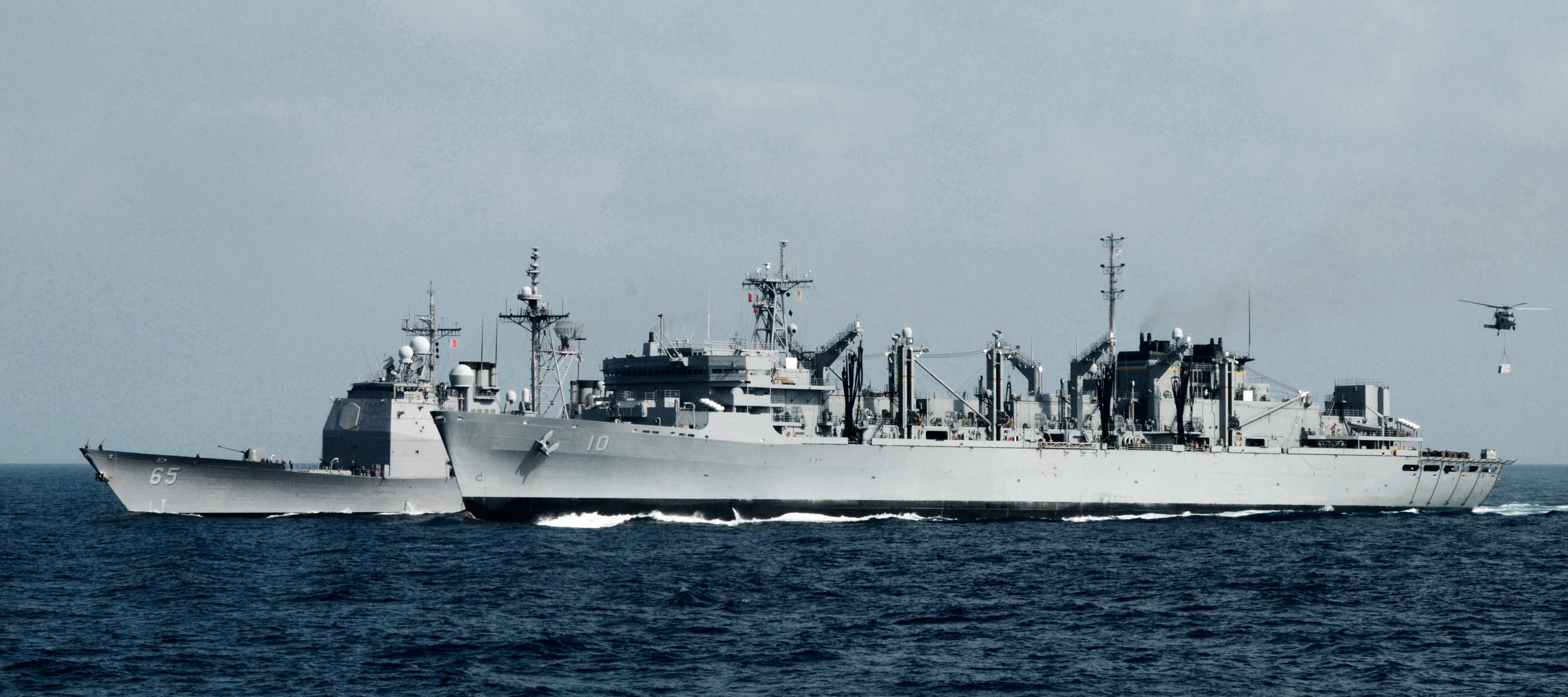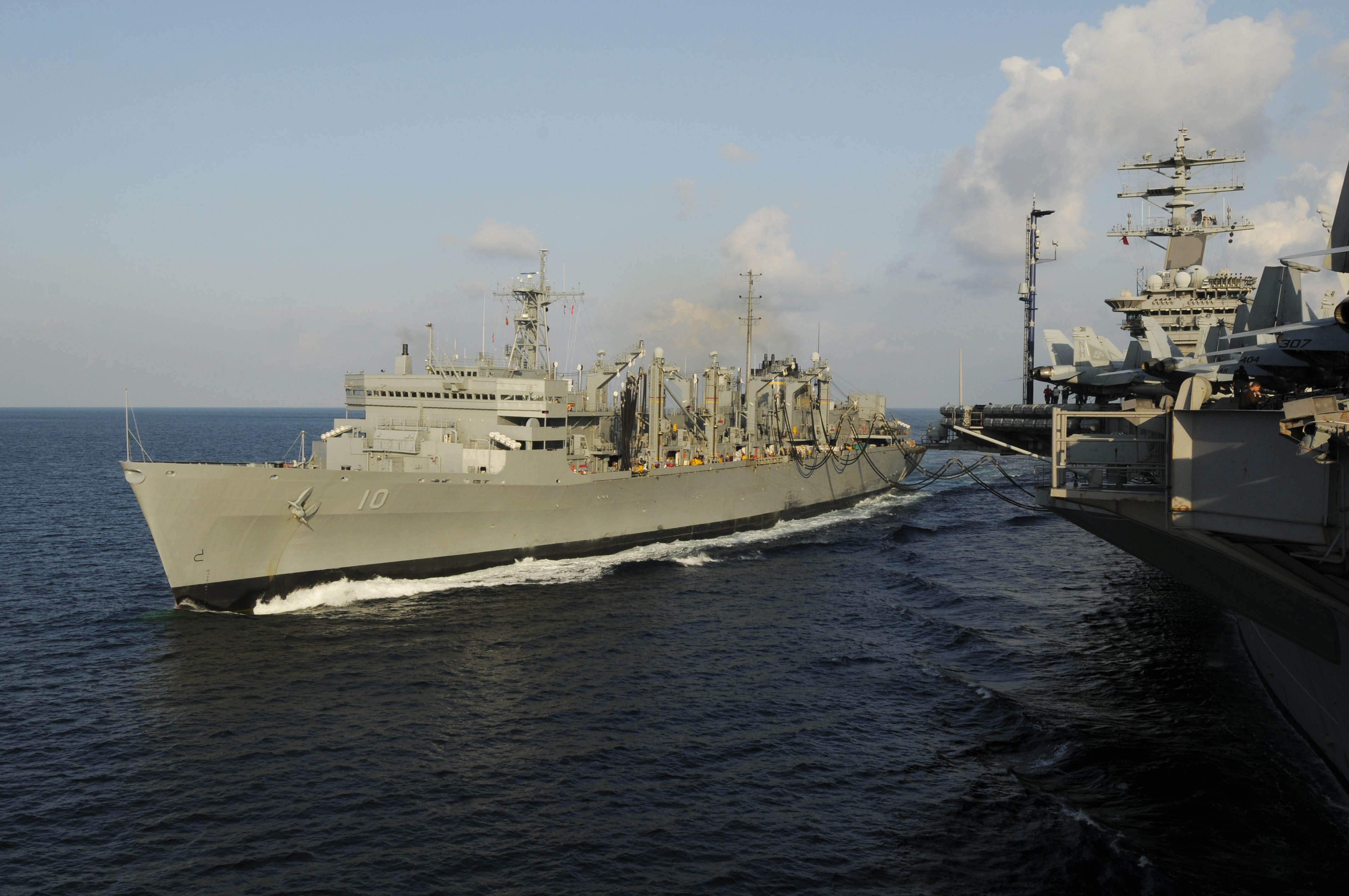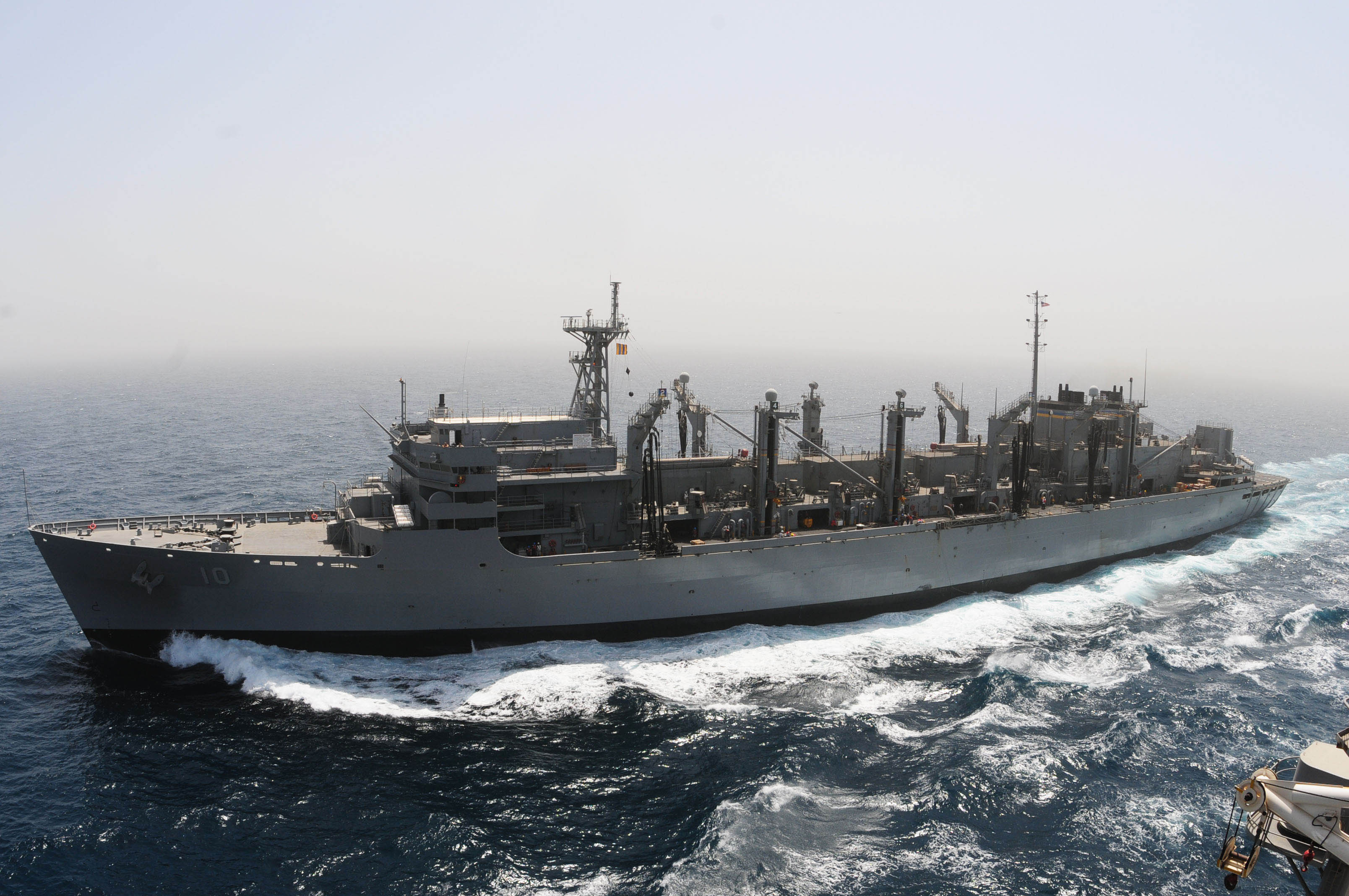 | 930k | USNS Bridge (T-AOE 10) conducts an underway replenishment at sea with the nuclear aircraft carrier USS Nimitz (CVN-68) (not shown) and the guided missile cruiser USS Vicksburg (CG-69). The Nimitz Carrier Strike Group is on a routine deployment to the U.S. 5th Fleet area of responsibility US Navy photo # 091001-N-3038W-310 INDIAN OCEAN (Oct. 1, 2009) by MC3 John Philip Wagner Jr. |