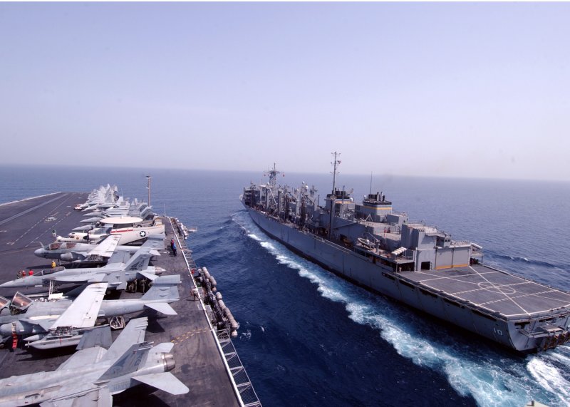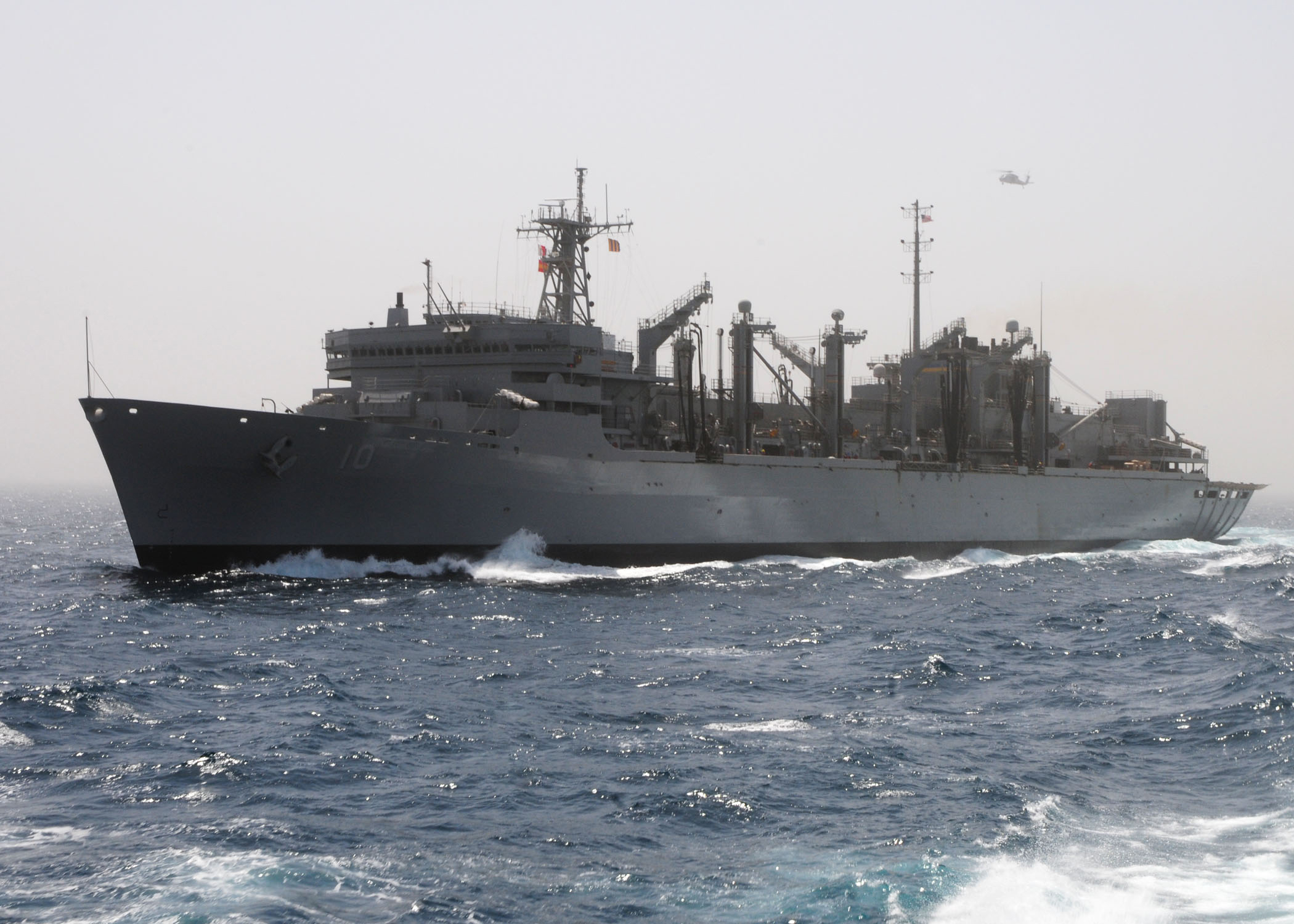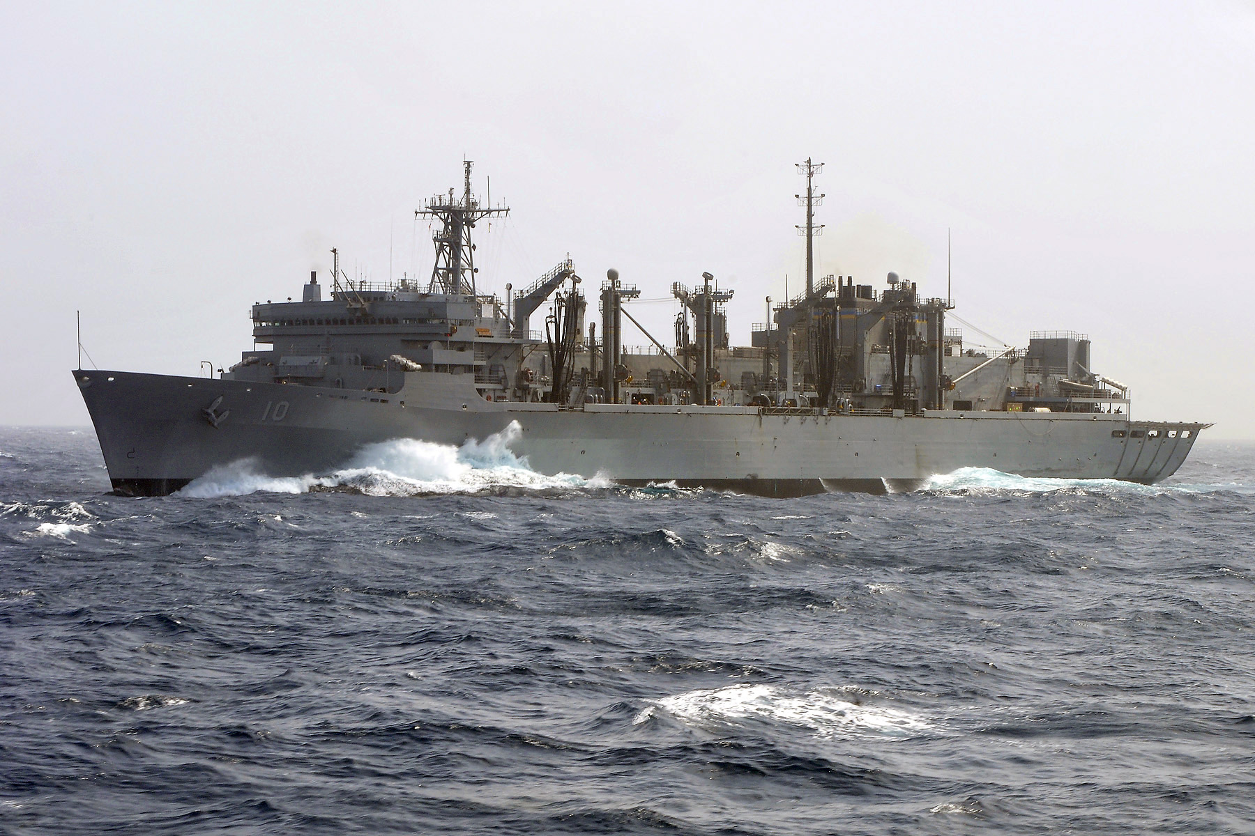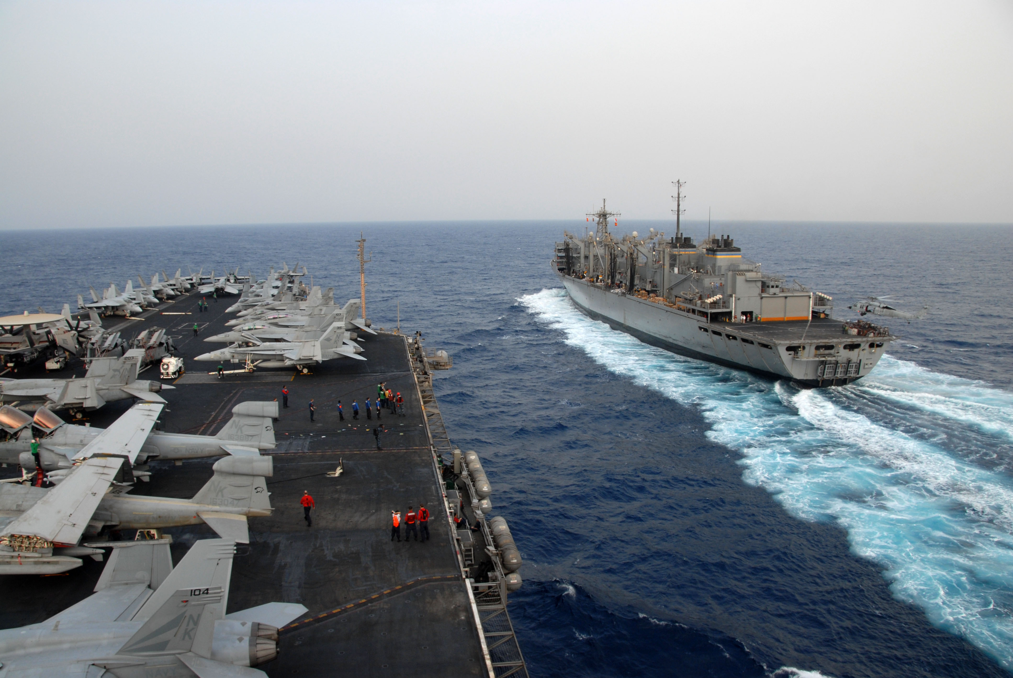 | 930k | USNS Bridge (T-AOE 10) conducts an underway replenishment at sea with the nuclear aircraft carrier USS Nimitz (CVN-68) (not shown) and the guided missile cruiser USS Vicksburg (CG-69). The Nimitz Carrier Strike Group is on a routine deployment to the U.S. 5th Fleet area of responsibility US Navy photo # 091001-N-3038W-310 INDIAN OCEAN (Oct. 1, 2009) by MC3 John Philip Wagner Jr. |