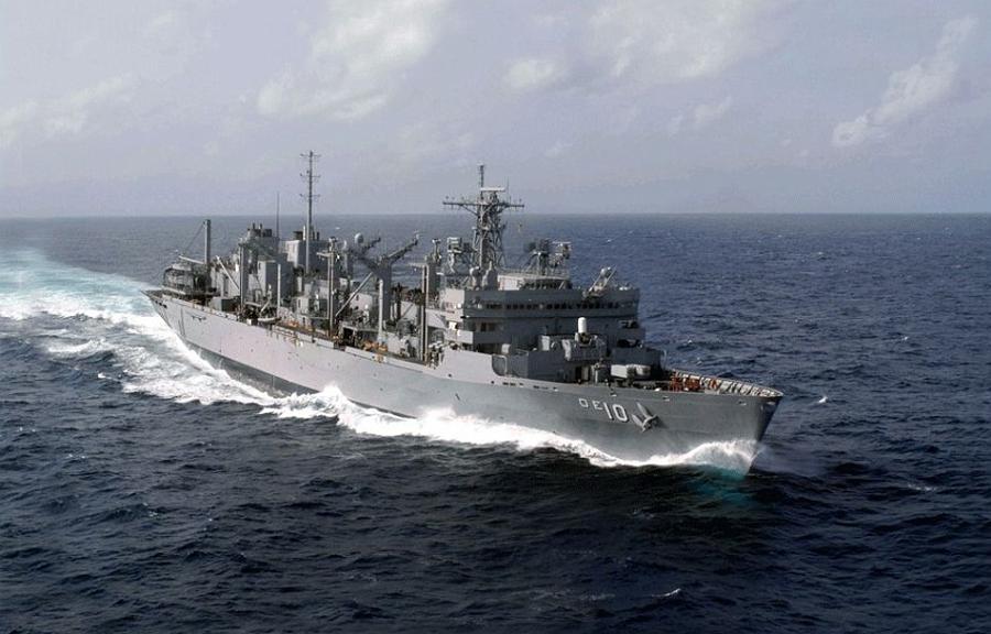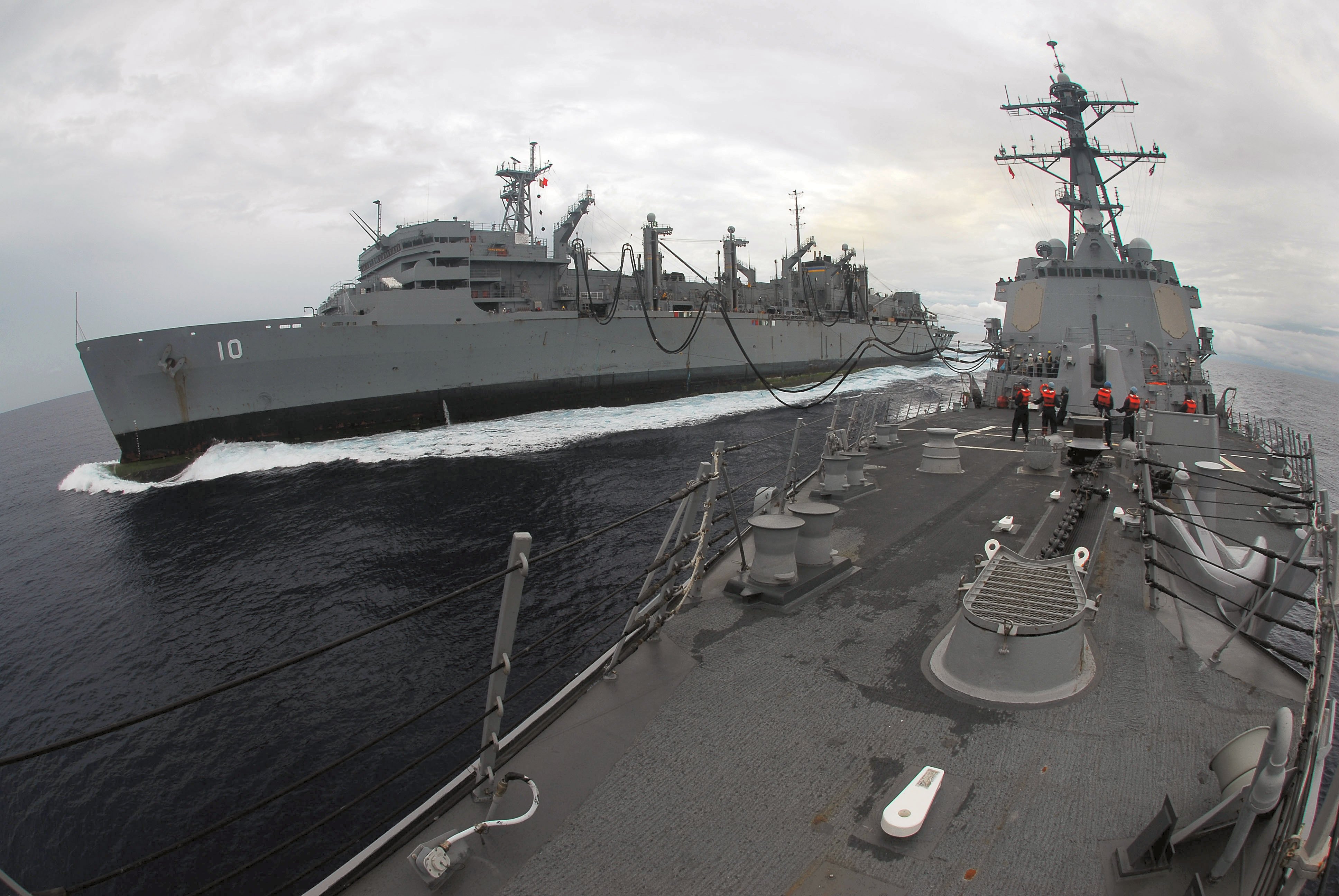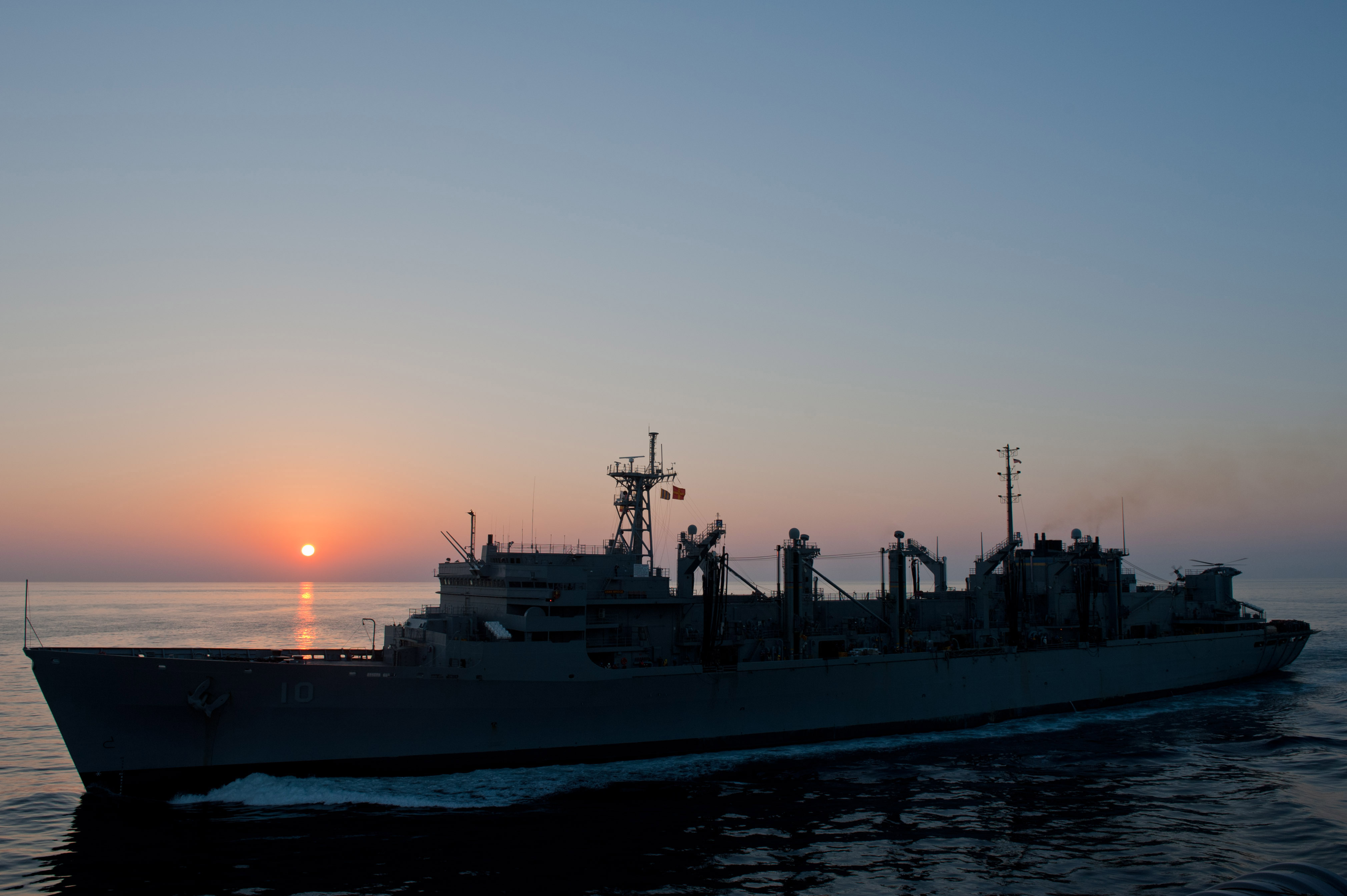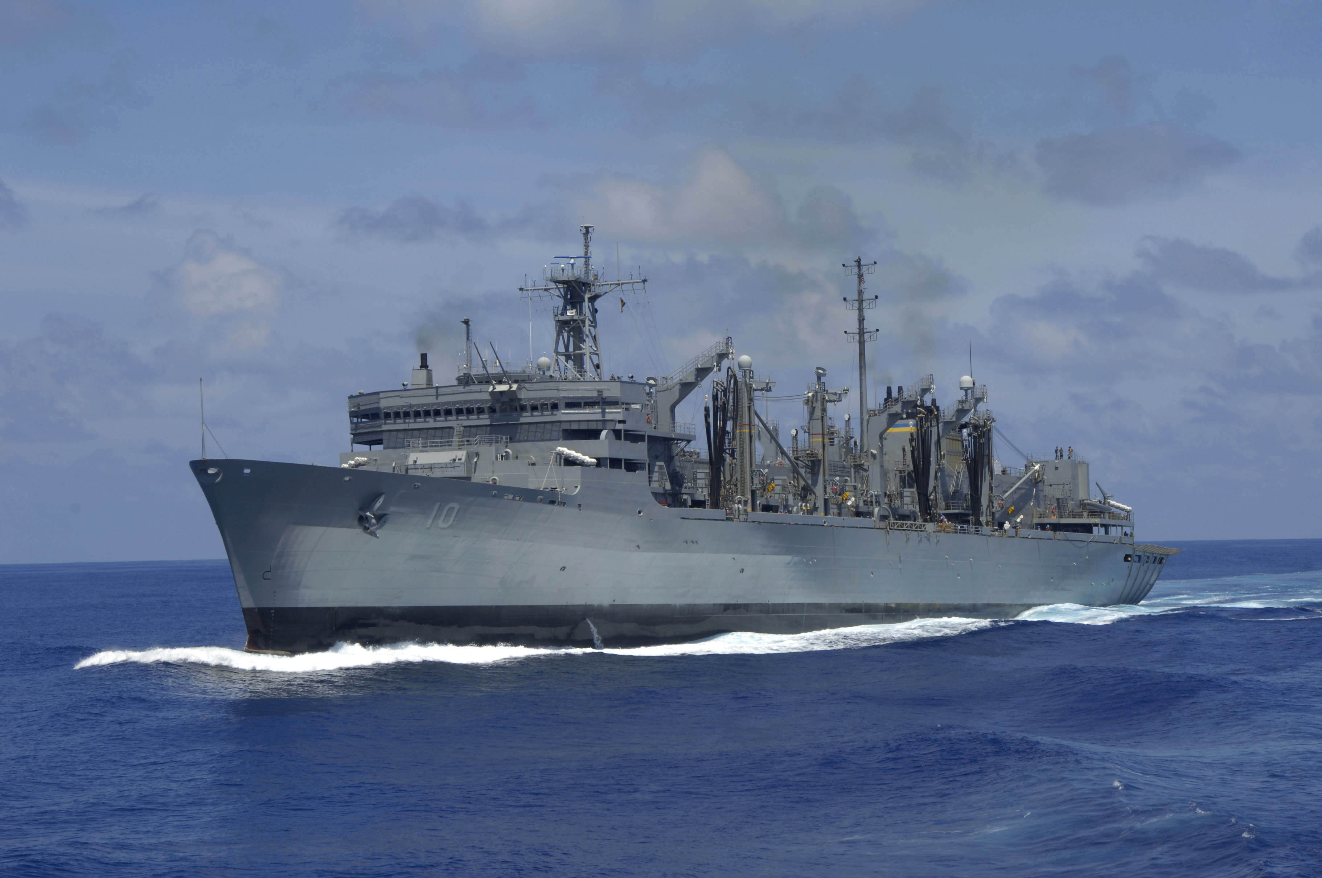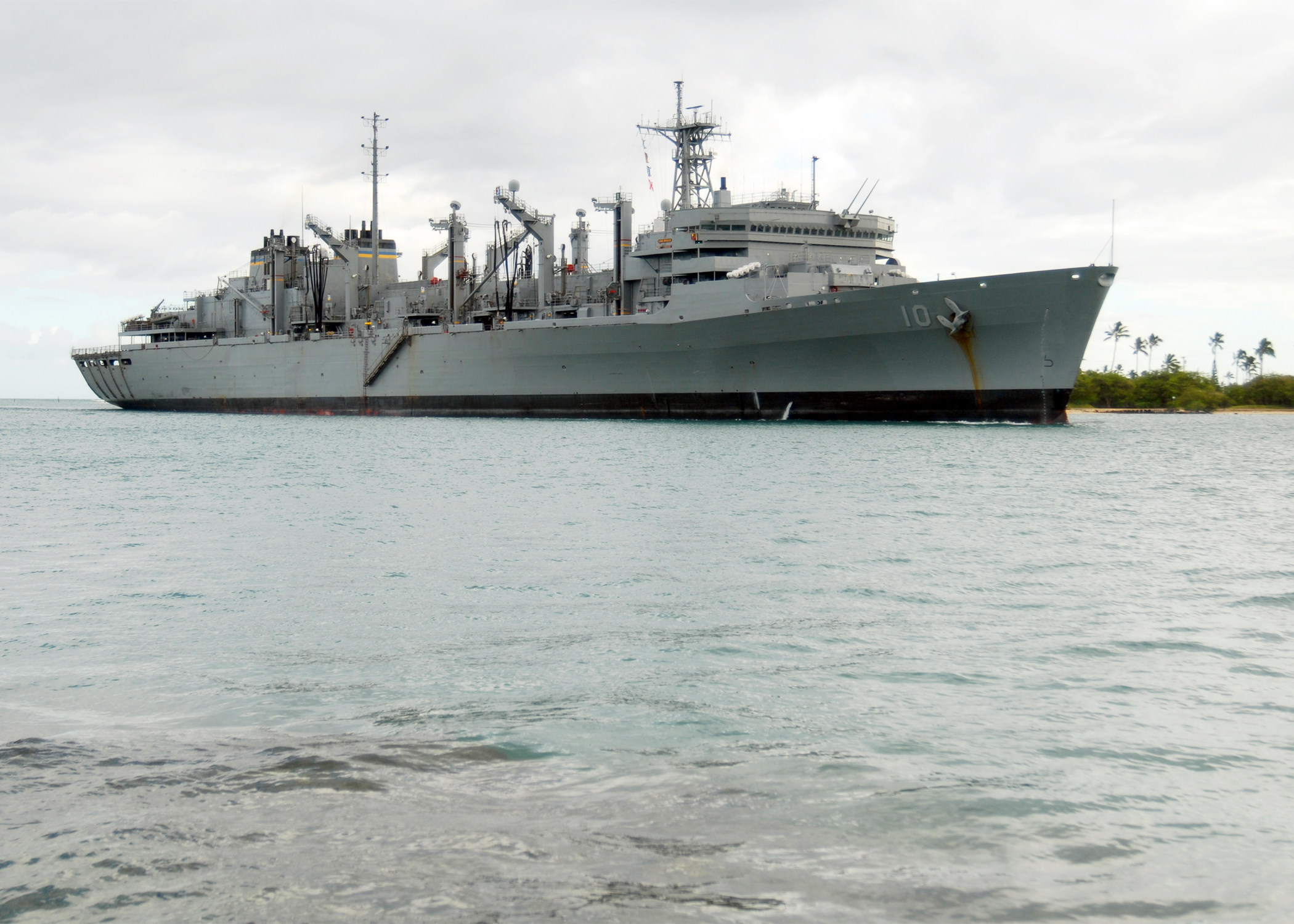 | 930k | USNS Bridge (T-AOE 10) conducts an underway replenishment at sea with the nuclear aircraft carrier USS Nimitz (CVN-68) (not shown) and the guided missile cruiser USS Vicksburg (CG-69). The Nimitz Carrier Strike Group is on a routine deployment to the U.S. 5th Fleet area of responsibility US Navy photo # 091001-N-3038W-310 INDIAN OCEAN (Oct. 1, 2009) by MC3 John Philip Wagner Jr. |