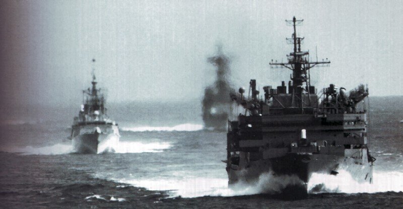 59 | USS Bridge (AOE-10) replenishes combat ships in support of Operation Enduring Freedom in 2001. US Navy photo from "Battle at Sea: 3,000 years of Naval Warfare," by R.G. Grant. |