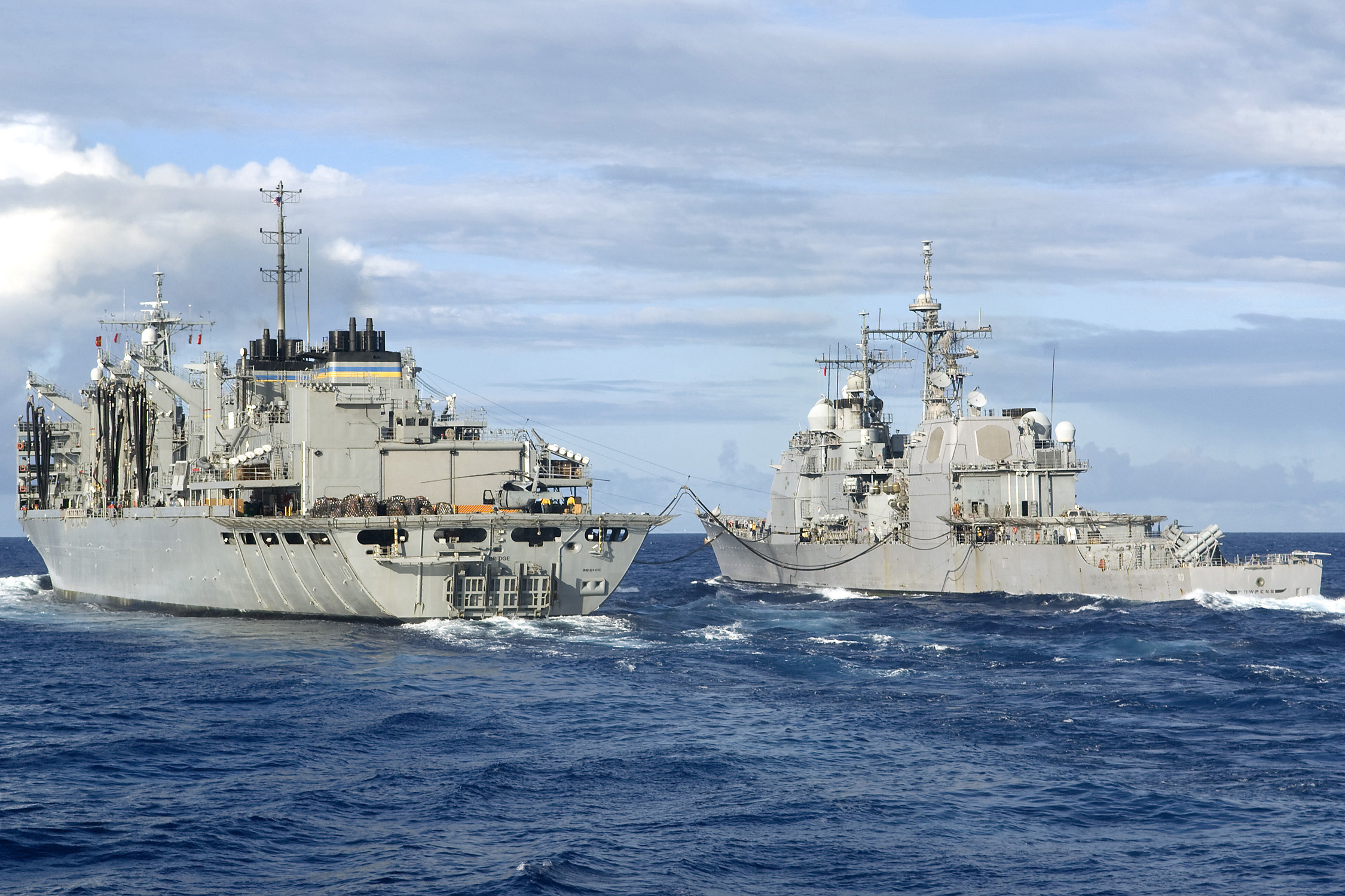 | 1314k | USNS Bridge (T-AOE 10) conducts an underway replenishment with the guided-missile cruiser USS Cowpens (CG-63) in the Pacific Ocean, 29 August 2009. US Navy photo # 090829-N-9123L-003 PACIFIC OCEAN (Aug. 29, 2009) by MC2 Byron C. Linder. |