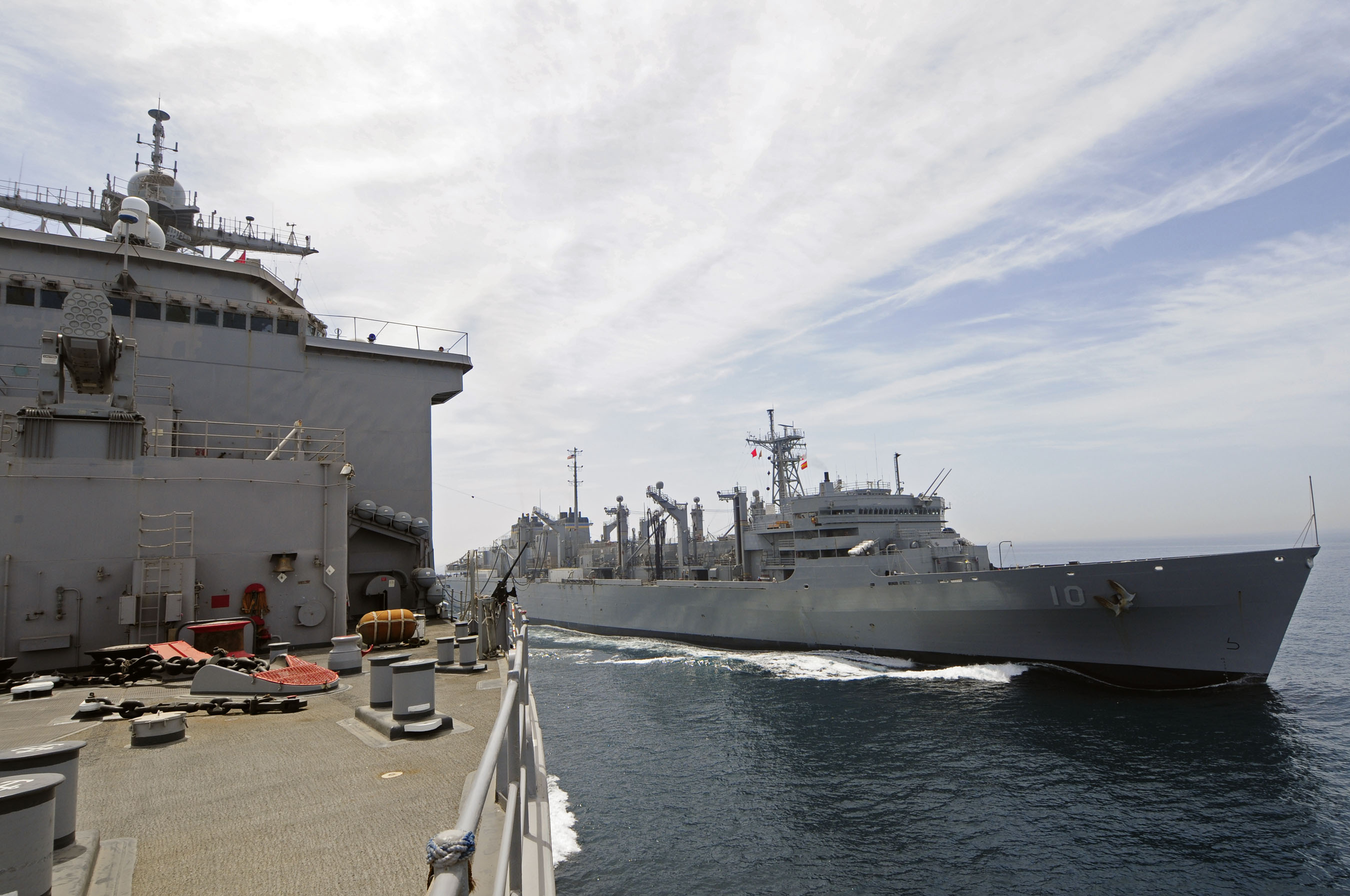 180k | USNS Bridge (T-AOE-10) connects with the amphibious dock landing ship USS Rushmore (LSD-47) and the amphibious assault ship USS Peleliu (LHA-5) during a replenishment at sea. Peleliu is the flagship for the Peleliu Amphibious Ready Group as is underway conducting a composite training unit exercise in the Pacific Ocean with Rushmore and the amphibious transport dock ship USS Green Bay (LPD-20). US Navy photo # 120802-N-LQ926-030 PACIFIC OCEAN (August 2, 2012) by MCSN Alex Van't Leven. |