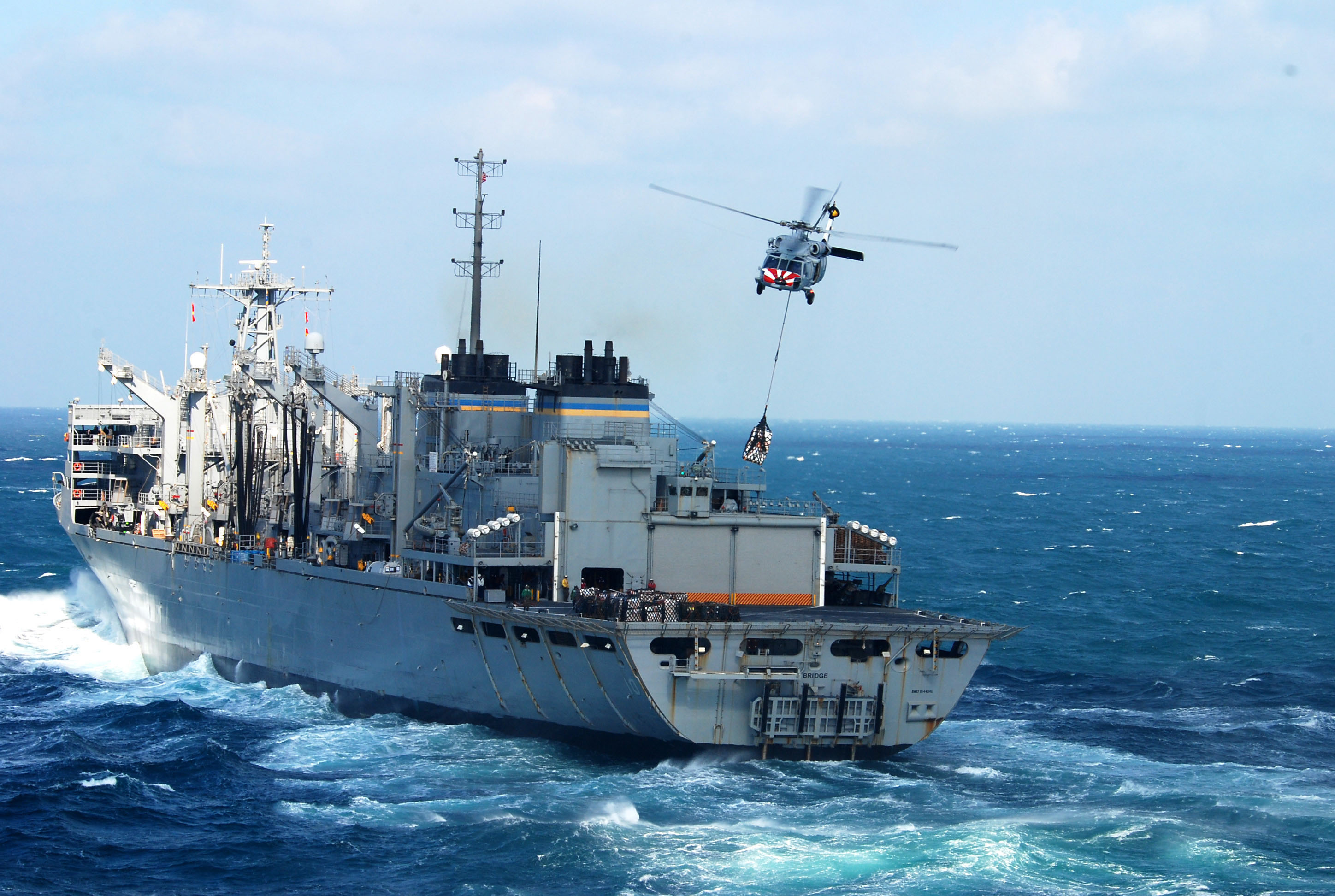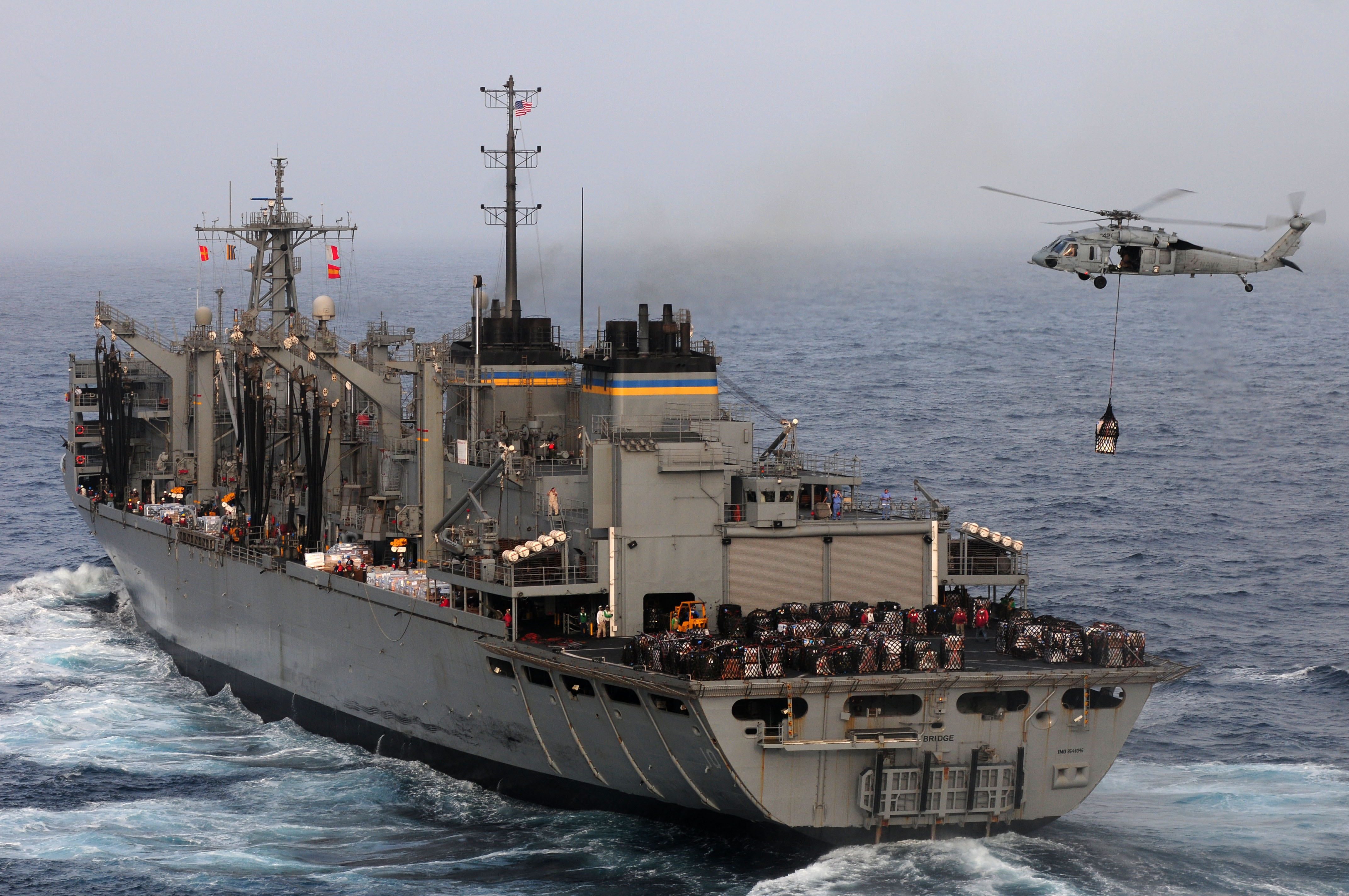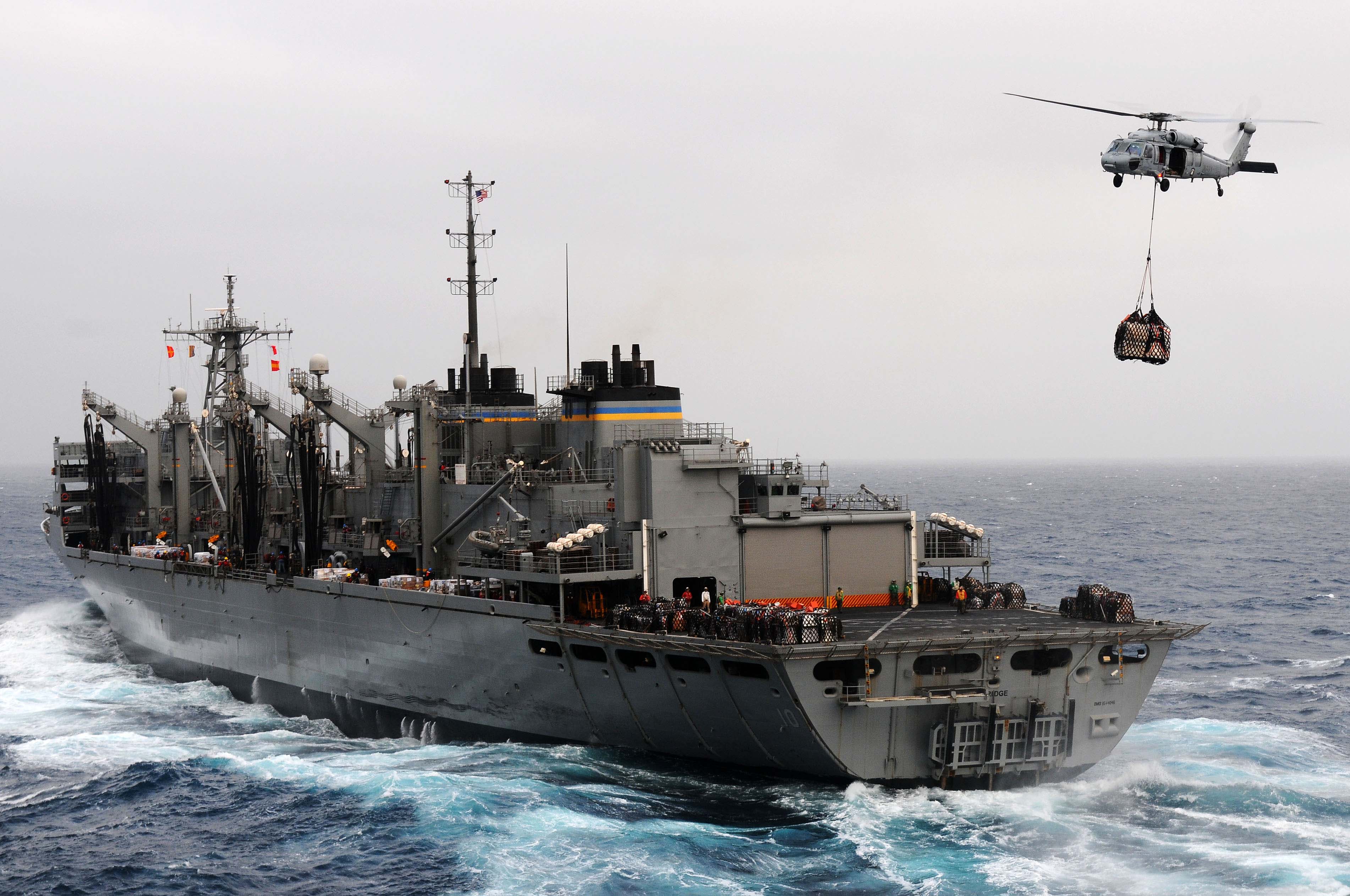 | 758k | An MH-60S Sea Hawk helicopter assigned to the Wildcards of Helicopter Sea Combat Squadron (HSC-23), delivers pallets to USNS Bridge (T-AOE-10) during a replenishment at sea with the aircraft carrier USS Nimitz (CVN-68). The Nimitz Carrier Strike Group is on a routine deployment to the U.S. 5th Fleet area of responsibility. US Navy photo # 091217-N-8421M-006 NORTH ARABIAN SEA (Dec. 17, 2009) by MC1 David Mercil |