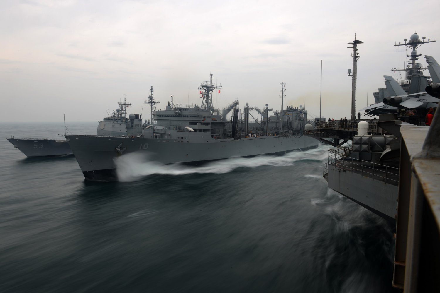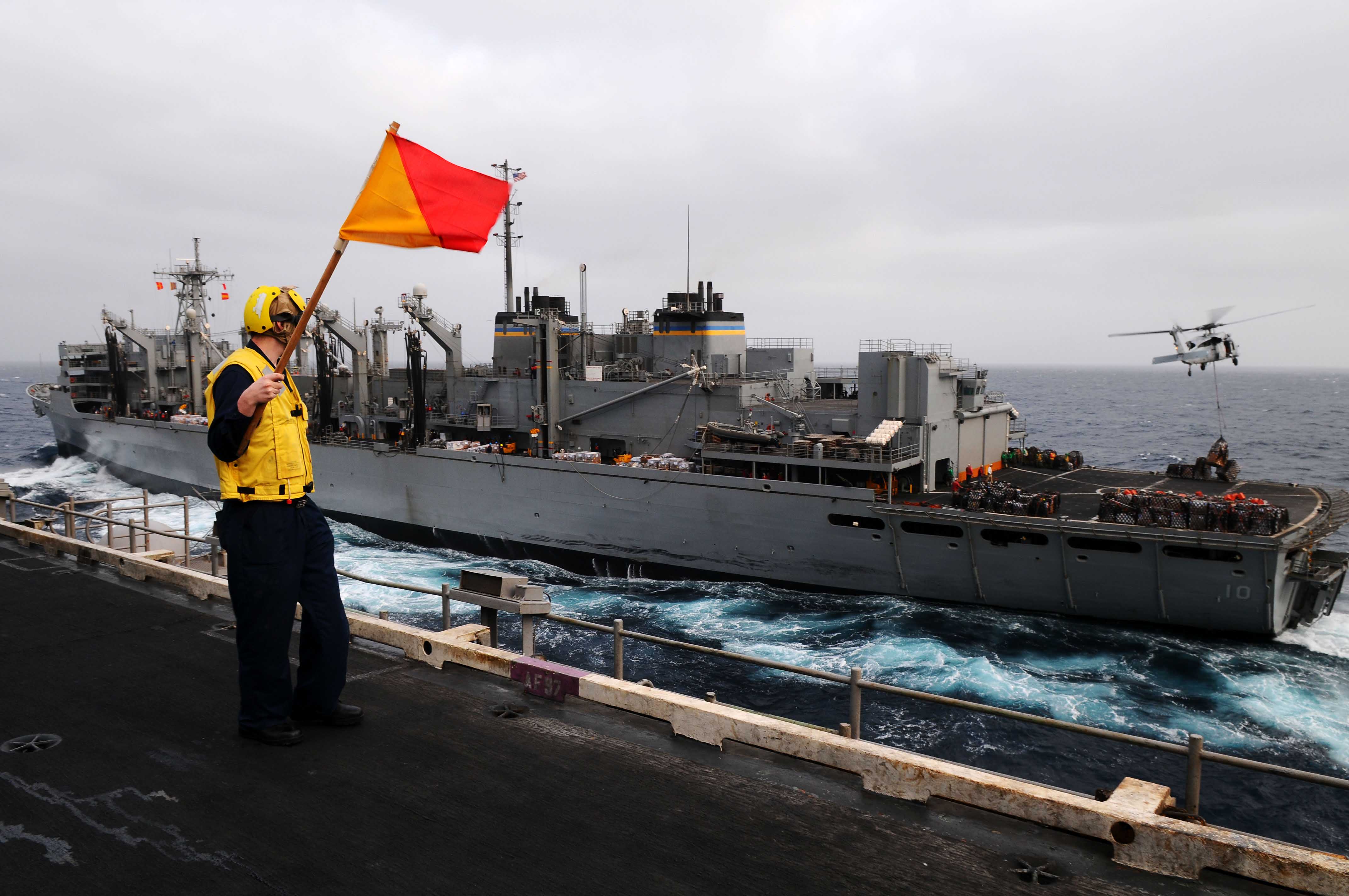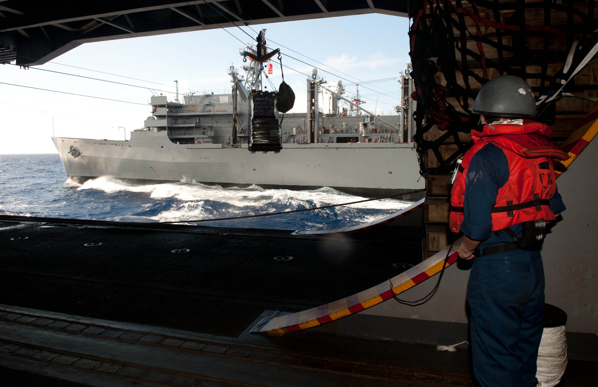 during a replenishment at sea in the Persian Gulf, 19 May 2011. USS Ronald Reagan and Carrier Air Wing