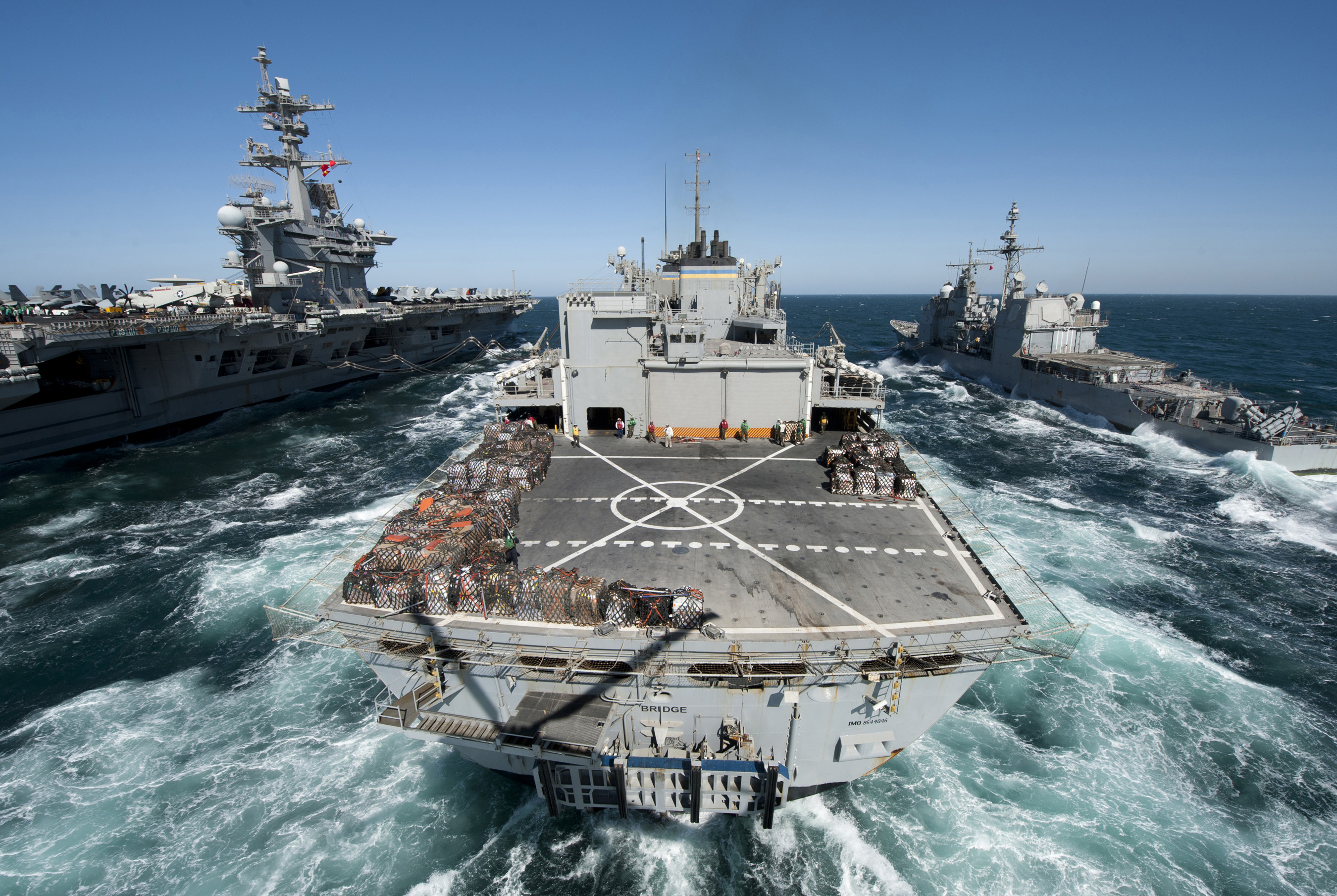 130k | The Ticonderoga-class guided-missile cruiser USS Mobile Bay (CG-53) and USNS Bridge (T-AOE-10) steam alongside the aircraft carrier USS John C. Stennis (CVN-74) during a replenishment-at-sea. John C. Stennis is deployed to the U.S. 5th Fleet area of responsibility conducting maritime security operations, theater security cooperation efforts and support missions for Operation Enduring Freedom. US Navy photo # 130129-N-OY799-301 U.S. 5TH FLEET AREA OF RESPONSIBILITY (Jan. 29, 2013) by MC2 Kenneth Abbate. |