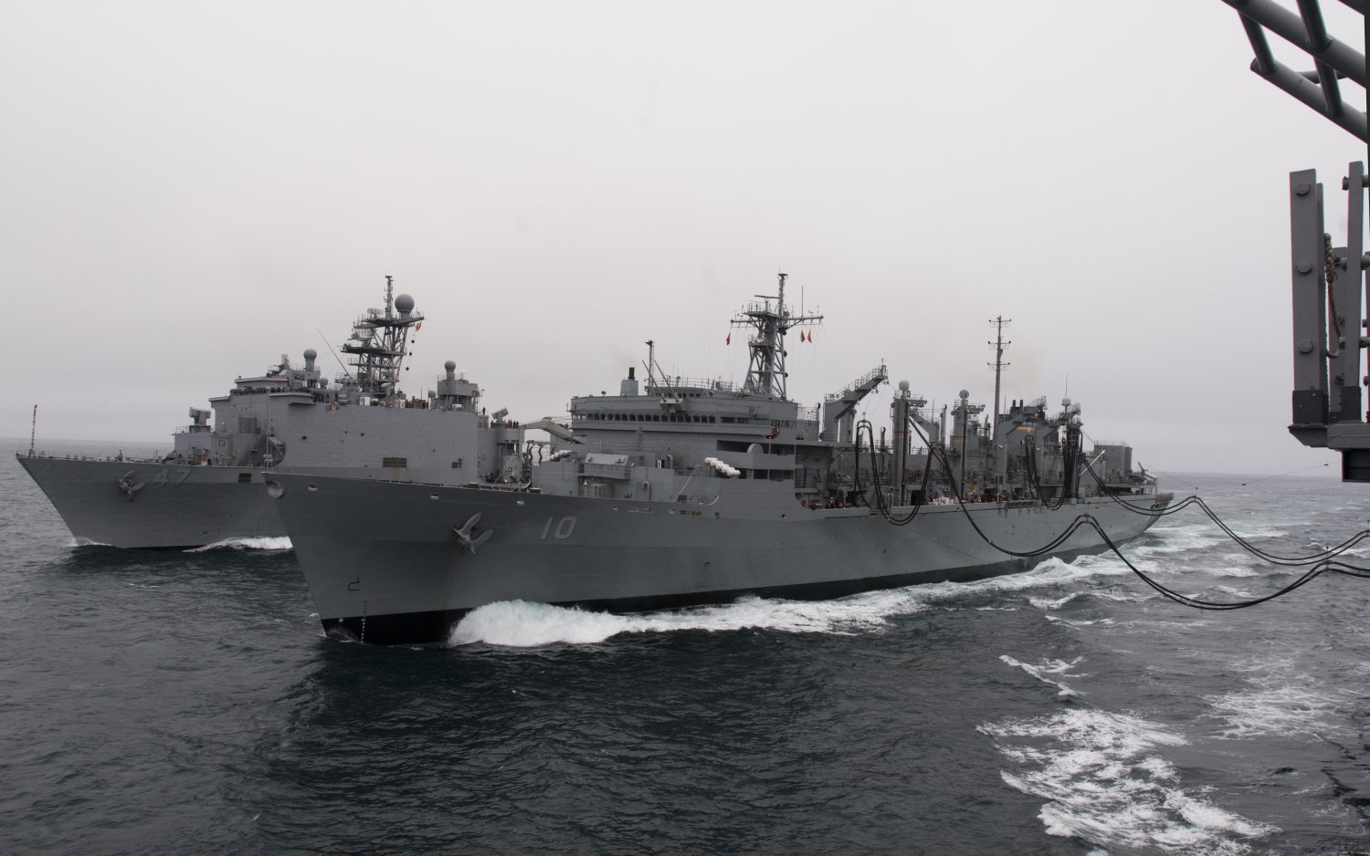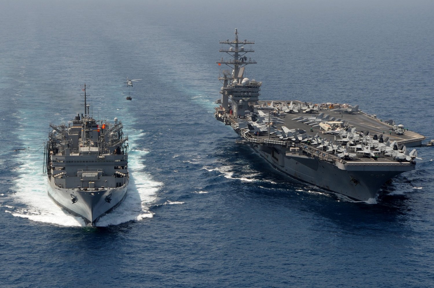 USS John C. Stennis (CVN-74) during an underway replenishment with USNS Bridge (T-AOE-10). John C. Stennis is returning to the U.S. 7th and 5th