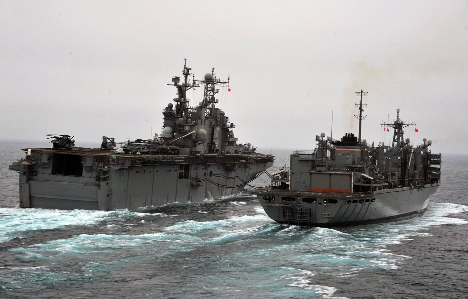 255k | USS Peleliu (LHA-5) receives fuel from USNS Bridge (T-AOE-10) during a replenishment at sea. Peleliu is the flagship for the Peleliu Amphibious Ready Group and is underway conducting a composite training unit exercise (COMPTUEX) in the Pacific Ocean with the amphibious dock landing ship USS Rushmore (LSD-47) and amphibious transport dock ship USS Green Bay (LPD-20). US Navy photo # 120802-N-YQ852-049 PACIFIC OCEAN (Aug. 2, 2012) by MC3 Shawnte Bryan. |