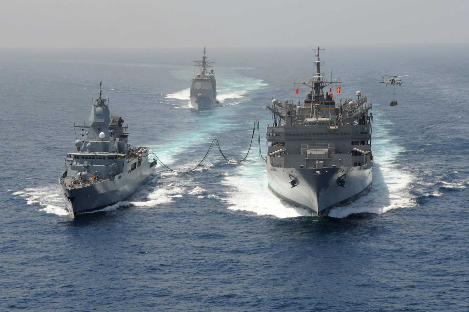 248k | The German navy frigate FGS Hamburg (F220) receives fuel from USNS Bridge (T-AOE-10) while the guided-missile cruiser USS Hue City (CG-66) is astern of Hamburg during a replenishment-at-sea. Hamburg is deployed to the US 5th Fleet area of responsibility promoting maritime security operations and theater security cooperation efforts. US Navy photos # 130323-N-GC639-165 ARABIAN SEA (March 23, 2013) and 130323-N-GC639-175 ARABIAN SEA (March 23, 2013) by MC2 Ryan D. McLearnon. |