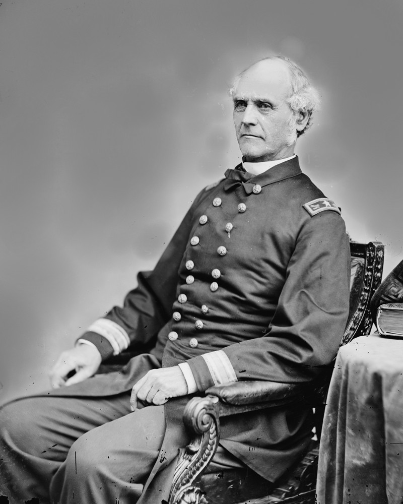141k | Horatio Bridge (1806-98) was born Augusta, Maine, and graduated from Bowdoin College in 1826. He was admitted to the bar in 1828 and practiced law until 1838 when he entered the Navy as a Purser. In 1854 he was named Chief of the Bureau of Provisions and Clothing. He was the first in the Navy to employ the idea of comprehensive fleet supply which was carried out with conspicuous success during the Civil War. He retired 8 April 1868 and was advanced to Pay Director with the relative rank of Commodore on the Retired List 3 March 1871. He died in 1898 at Athens, Pa. (Text from DANFS) |