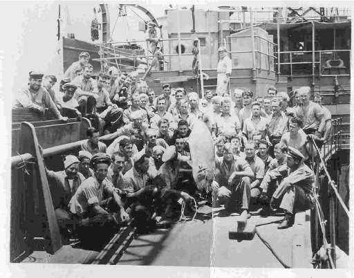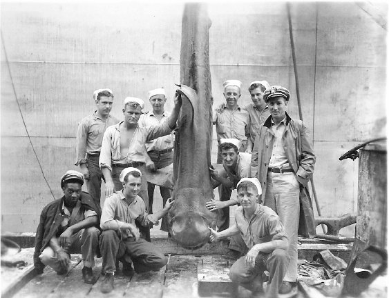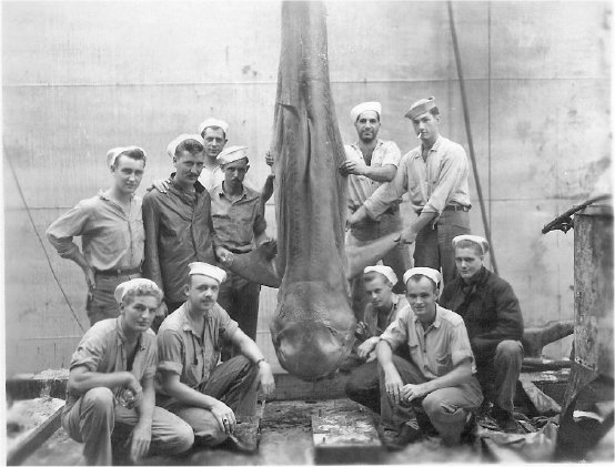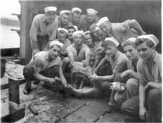 64k | USS ARD-8 crew photo, Midway Island. (Ray Rucker says they had the best fish in the Pacific, but the shark was a bit of a surprise.) |