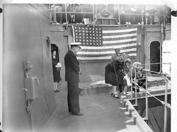 60k | USS ARD-8 commissioning day ceremonies, at Pacific Bridge Co., Alameda, CA., breaking the traditional champagne bottle. | Susan Bloom for her uncle Raymond Rucker USS ARD-8. | |