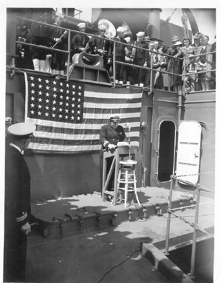 68k | USS ARD-8 commissioning day ceremonies, at Pacific Bridge Co., Alameda, CA., the Captain reads his orders and places the dock in commission. | Susan Bloom for her uncle Raymond Rucker USS ARD-8. | |