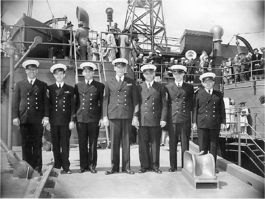 70k | USS ARD-8 commissioning day ceremonies, at Pacific Bridge Co., Alameda, CA., the docks seven Chief Petty Officers. | Susan Bloom for her uncle Raymond Rucker USS ARD-8. | |