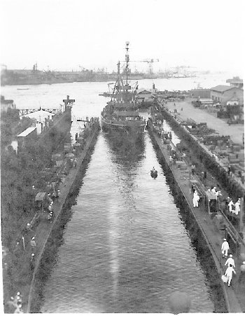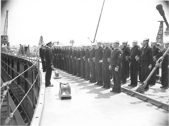 45k | USS ARD-8 commissioning day ceremonies, at Pacific Bridge Co., Alameda, CA., the docks crew at attention. | Susan Bloom for her uncle Raymond Rucker USS ARD-8. | |