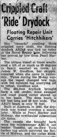 38k | Newspaper article from "San Diego Sun" announcing the return to San Diego of USS ARD-8 26 March 1946 with two accompanying tugs and the yard net tender, tug Tamaha (YNt-12), the coastal mine sweeper USS Cockatoo AMc-8) and Coast Guard cutter CG83508 in her dock. | Clayton E. Hiscock PTR3C USS ARD-8. | |