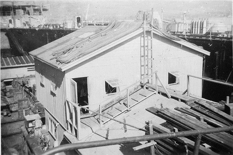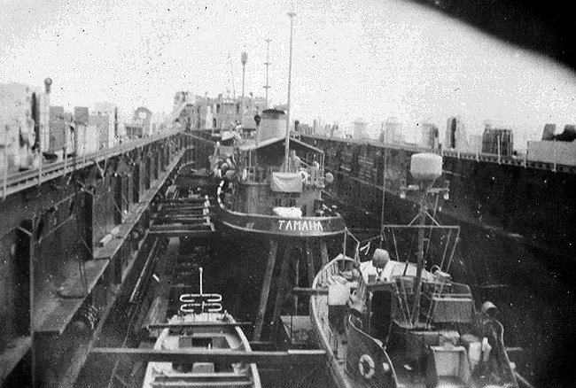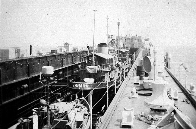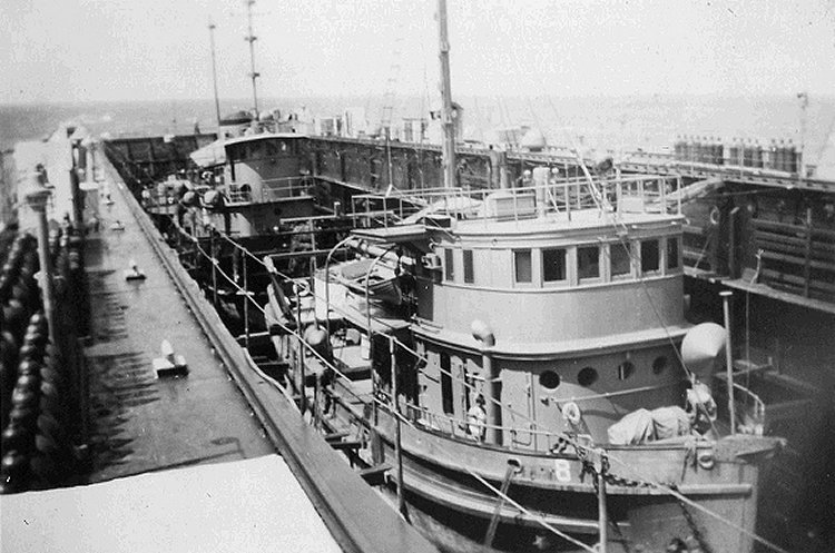 69k | View from the bow of USS ARD-8 at Pearl Harbor, circa February-March 1946, while preparing to transport the yard net tender, tug Tamaha (YNt-12) in the dock to San Diego, CA. Notice the beams to hold the tug in place. | Photo by Clayton E. Hiscock PTR3C USS ARD-8 | |