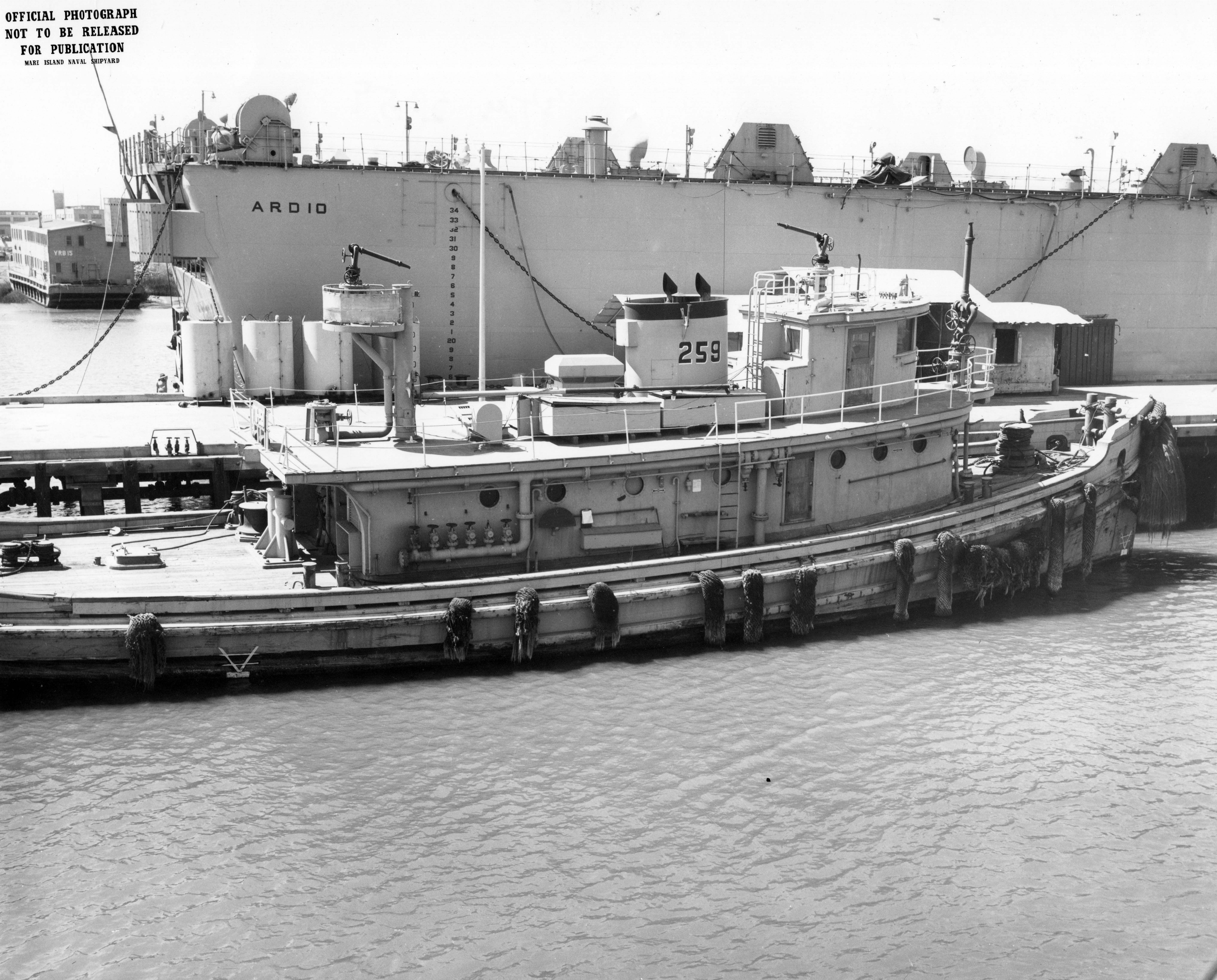 1598k | Arivaca (YTM-259), ARD-10 in the foreground and YRB-15 in the background, berthed in the reserve fleet area on the north end of Mare Island Naval Shipyard, 09 September 1963. US Navy photo. |