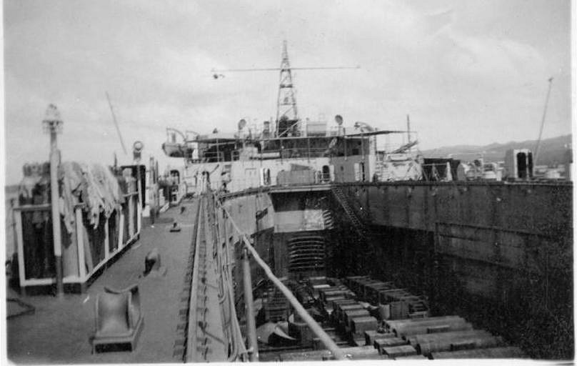 USS ARD-13 port side basin wing, midships view looking forward, Guam, Marianas, 8 January 1946. |