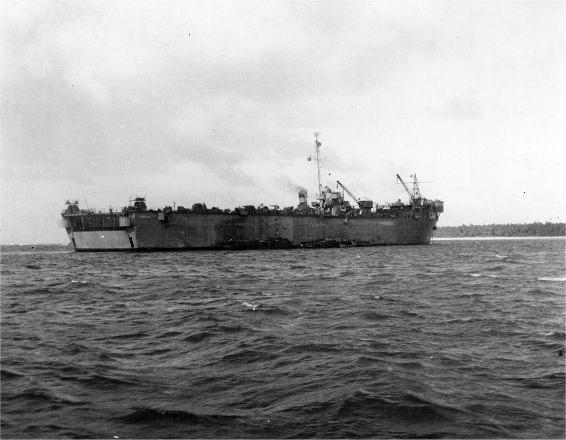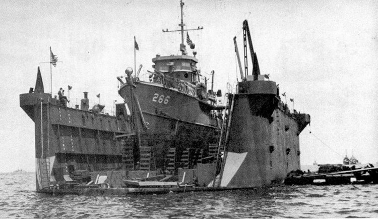 USS LCS(L)(3)-76 drydocked in USS ARD-13 at Nakagusuku Wan, Okinawa Sept. 1945 |