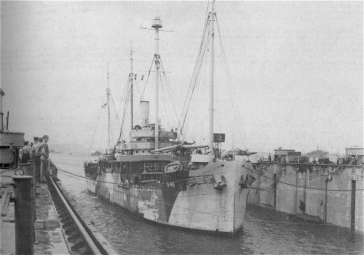 USS Anacapa (AG-49) entering USS ARD-13, 10 February 1945. Note the hinged flaps just aft of the Anacapa's anchor--a reminder of her "Q"-ship career |