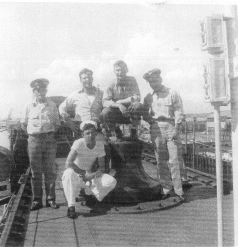 101k | USS ARD-29's Electricians "Electrical Gang", January 1951, Submarine Base Pearl Harbor. Left to Right EMC Wilson, EMP2/c Tankersley, EMP3/c Swain, EMC Hamilton, kneeling, EMFN Ostermeir. | Rocky Tankersley EMP2/c USNR, USS ARD-29, 21 Sept. 1950 to 4 Jan. 1952. | |