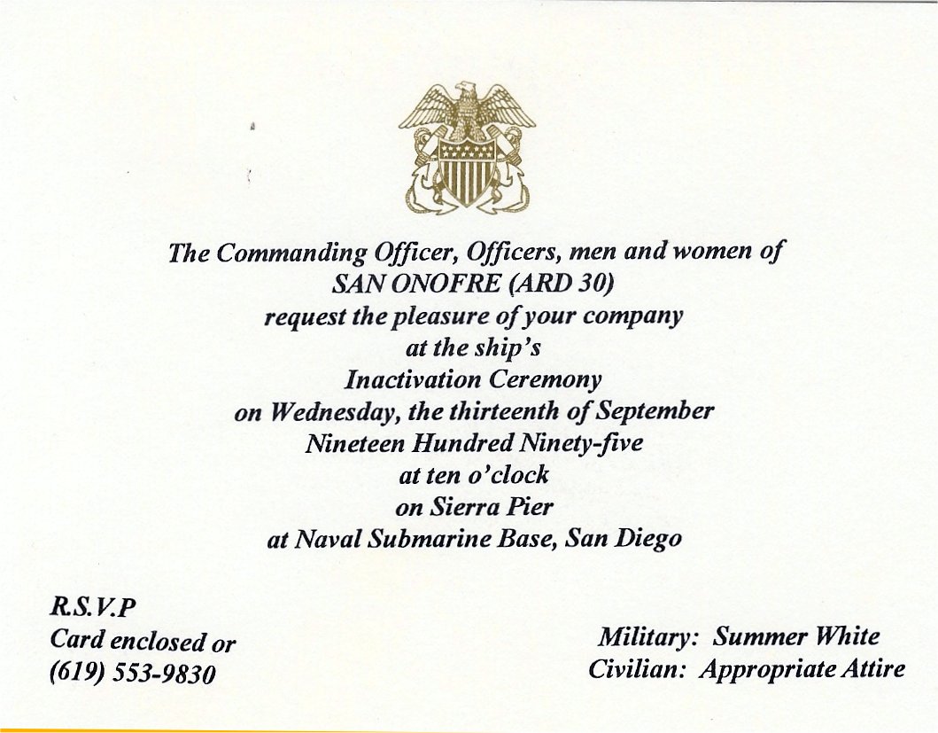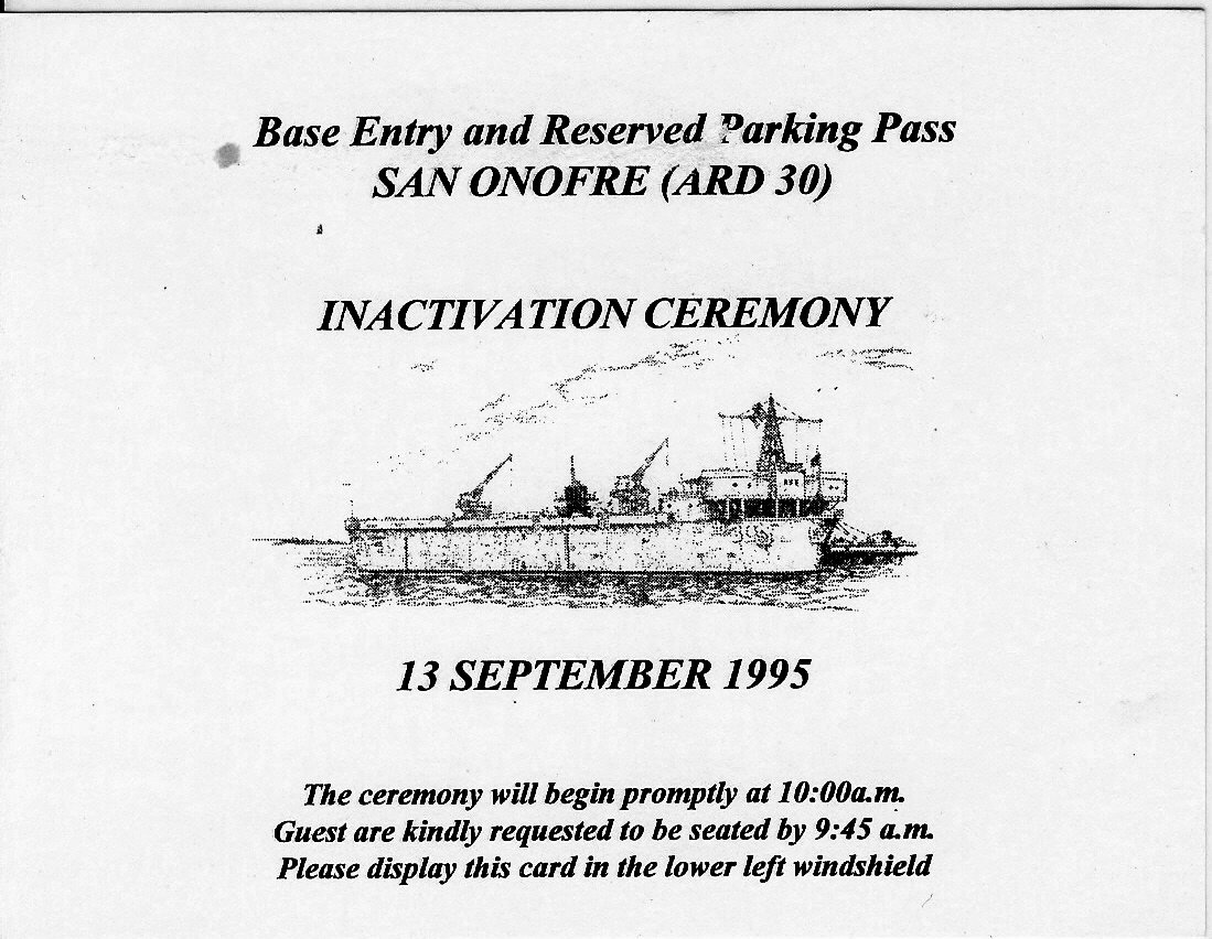130k | Invitation and Base Entry and Reserved Parking Pass for the inactivation ceremony for San Onofre (ARD-30) at Naval Station San Diego, CA., 13 September 1995. | Richard Hoffner | |