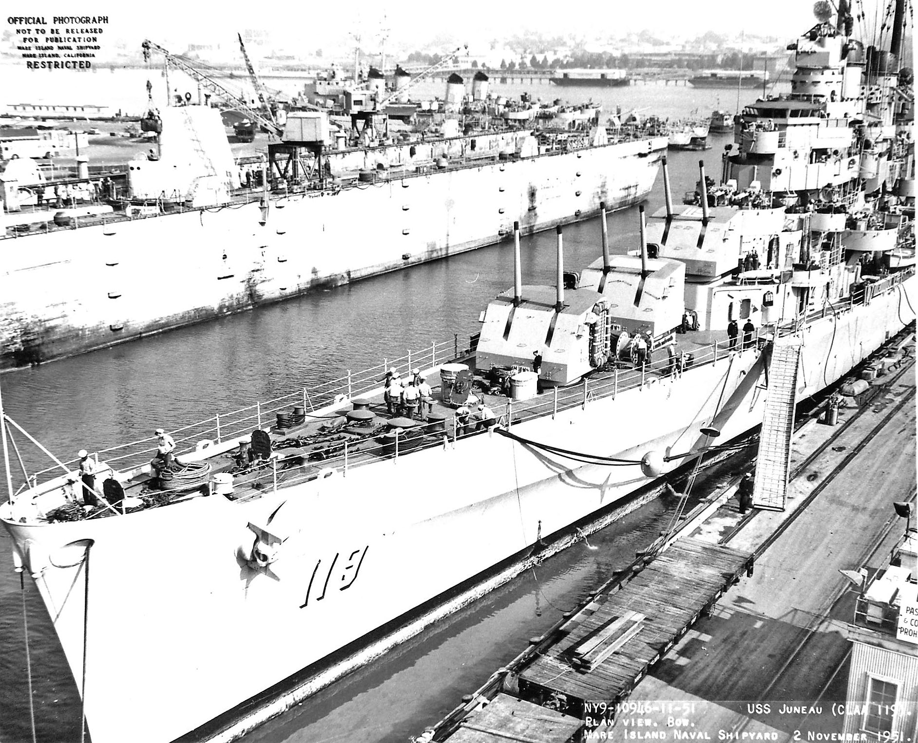 557k | ARD-32 with USS Charr (SS-328) docked is across from USS Juneau (CLAA-119) at Mare Island Naval Shipyard, 2 November 1951. USS Gurke (DD-783) and USS Rowan (DD-782) are aft of ARD-32. Mare Island Naval Shipyard photo # 10946-11-51. | Darryl Baker | |