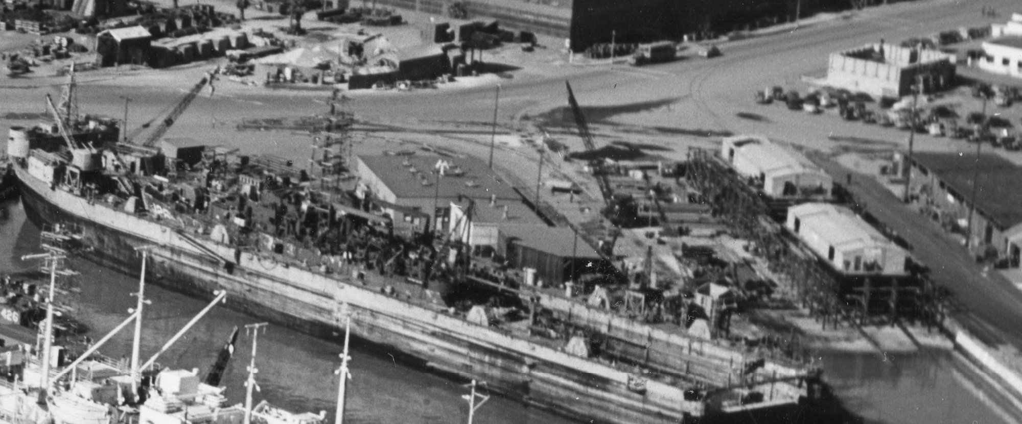 112k | ARD-32 on the quay wall to the far right with USS Cod (SS-224) drydocked. At the center of the photo is a stern view of USS Abatan (AW-4) in dry dock #3 at Mare Island on 23 Jan 1945. USS New Orleans (CA-32) is in dock # 2 beyond Abatan. Navy Yard Mare Island photo # 610-45. |