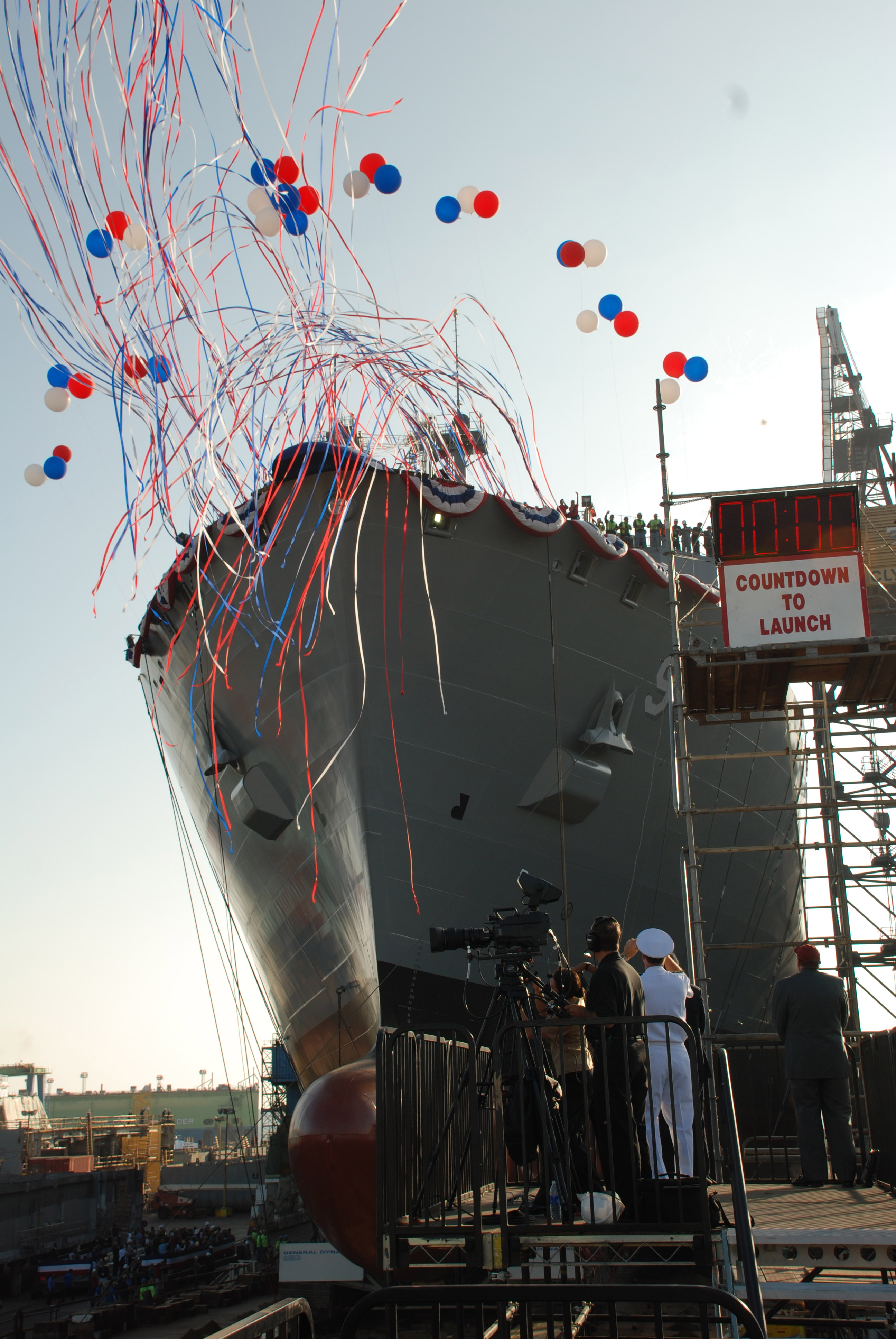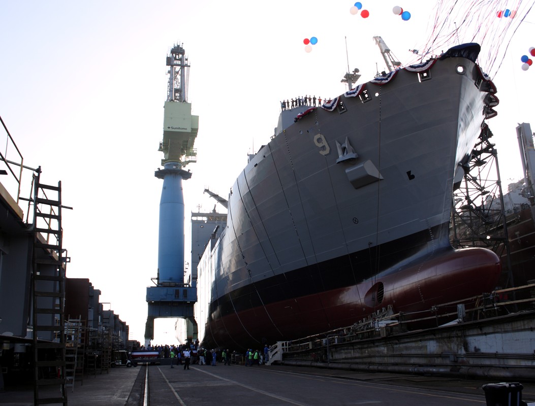 159k | USNS Matthew Perry (T-AKE-9) slides down the ways at the NASSCO shipyards, San Diego, CA., 6 August 2009. Photo by Frelon420 (real name unknown). |