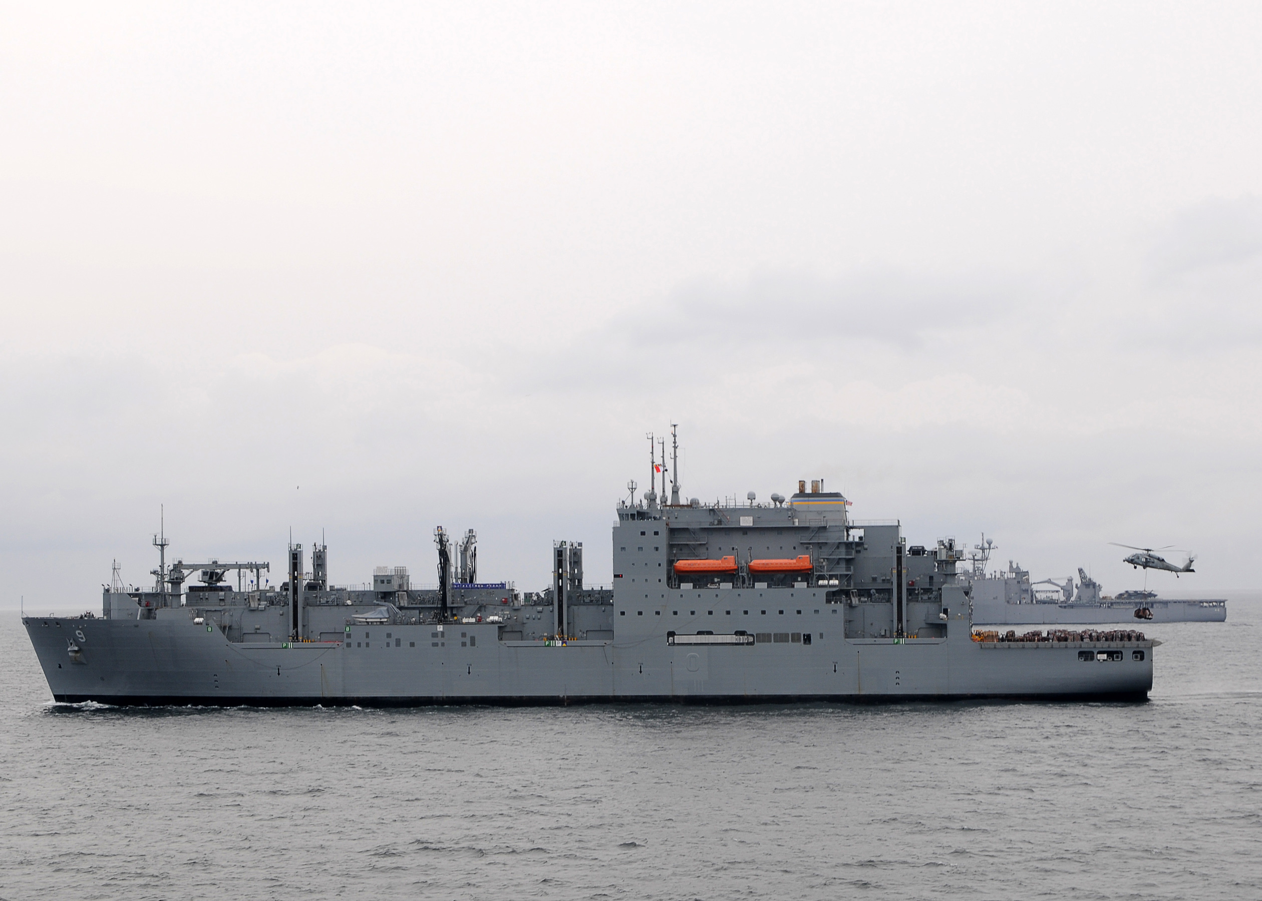 233k | Amphibious Landing Ship Dock USS Germantown (LSD-42) and USS Peleliu (LHA-5) steam, alongside USNS Matthew Perry (T-AKE-9) for a replenishment-at-sea. Germantown and Peleliu are part of the Peleliu Amphibious Ready Group conducting joint forces exercises in the US 7th Fleet area of responsibility. US Navy photo # 140909-N-UD469-065 PHILIPPINE SEA (Sept. 9, 2014) by MC2 Amanda R. Gray. |