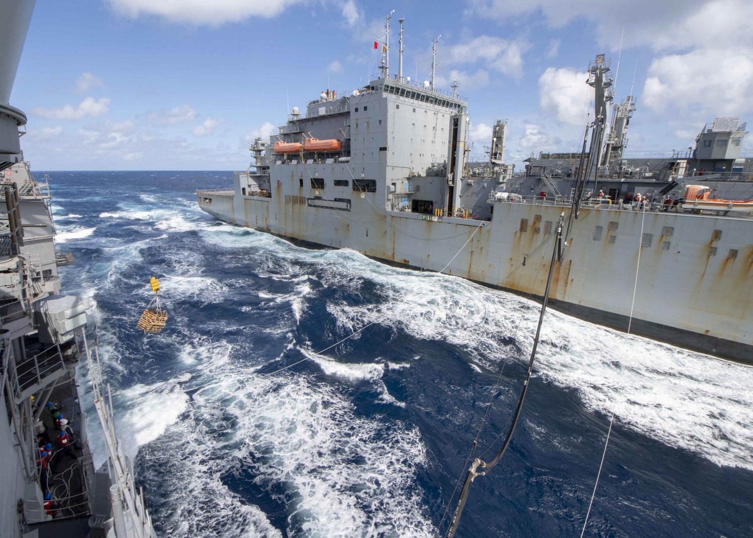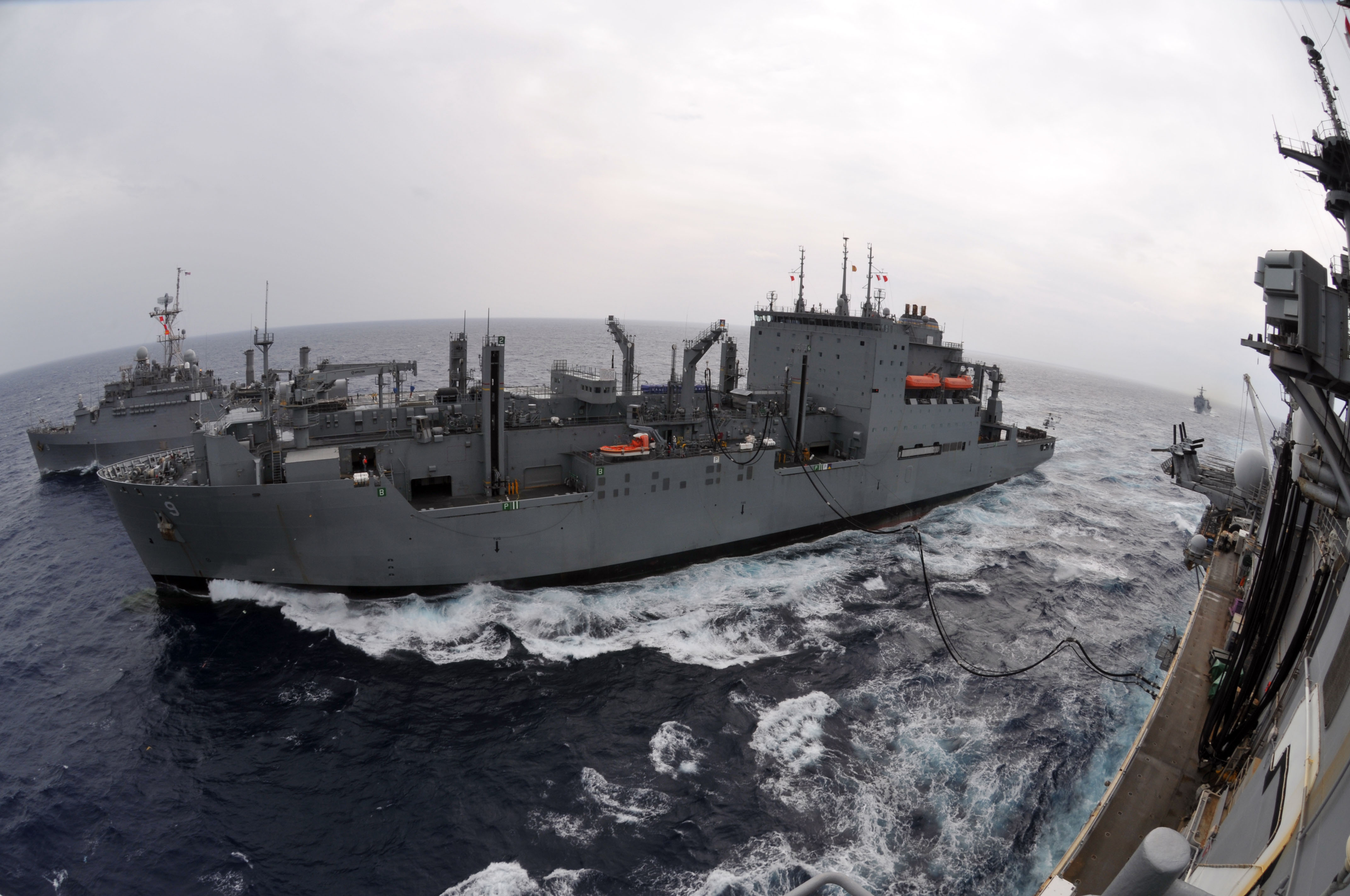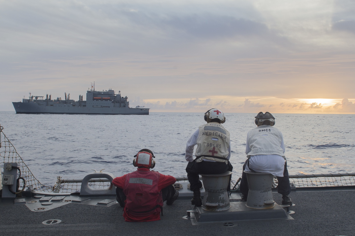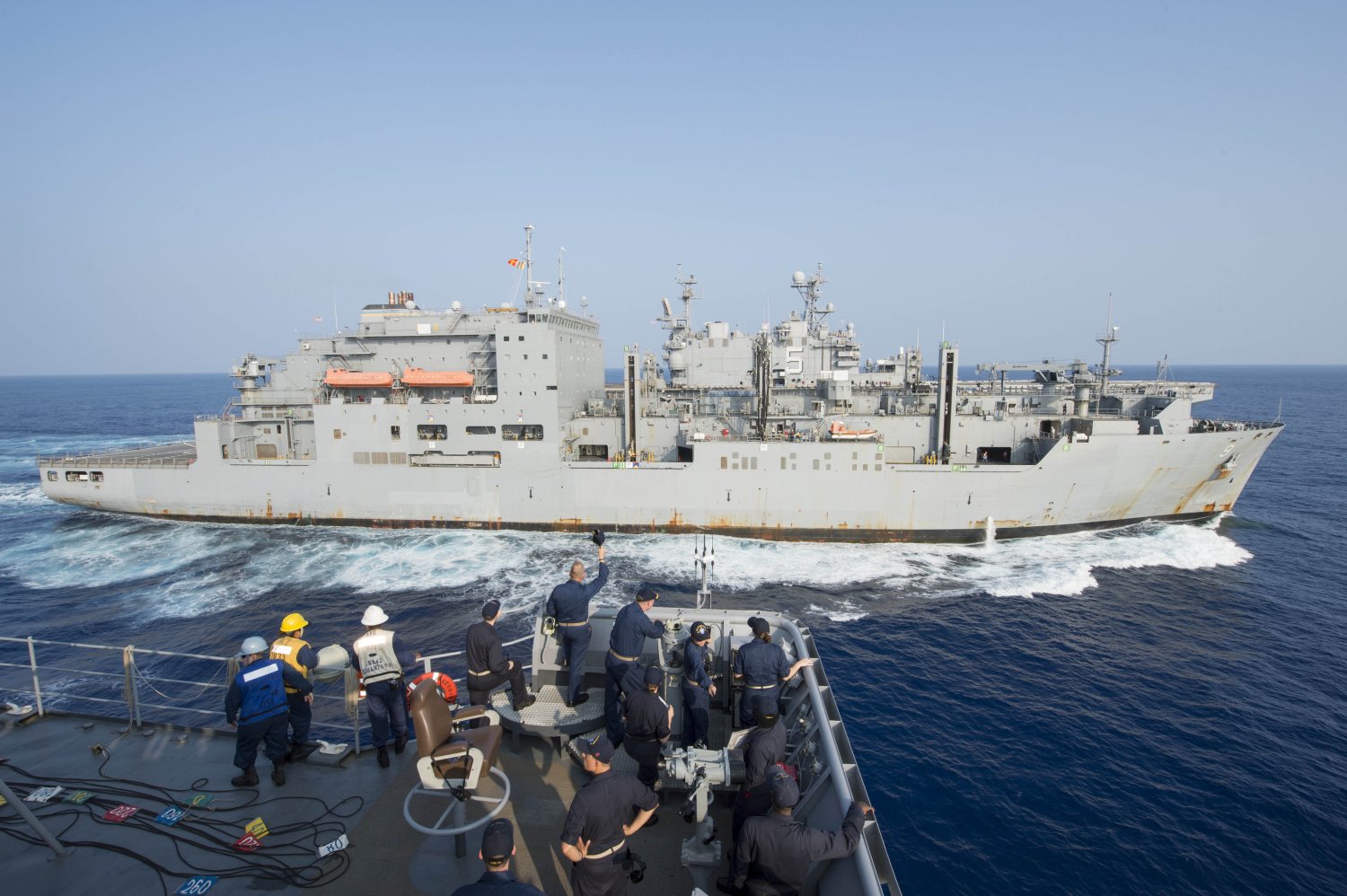 USS Curtis Wilbur (DDG-54) wait on station as USNS Matthew Perry (T-AKE-9) sends