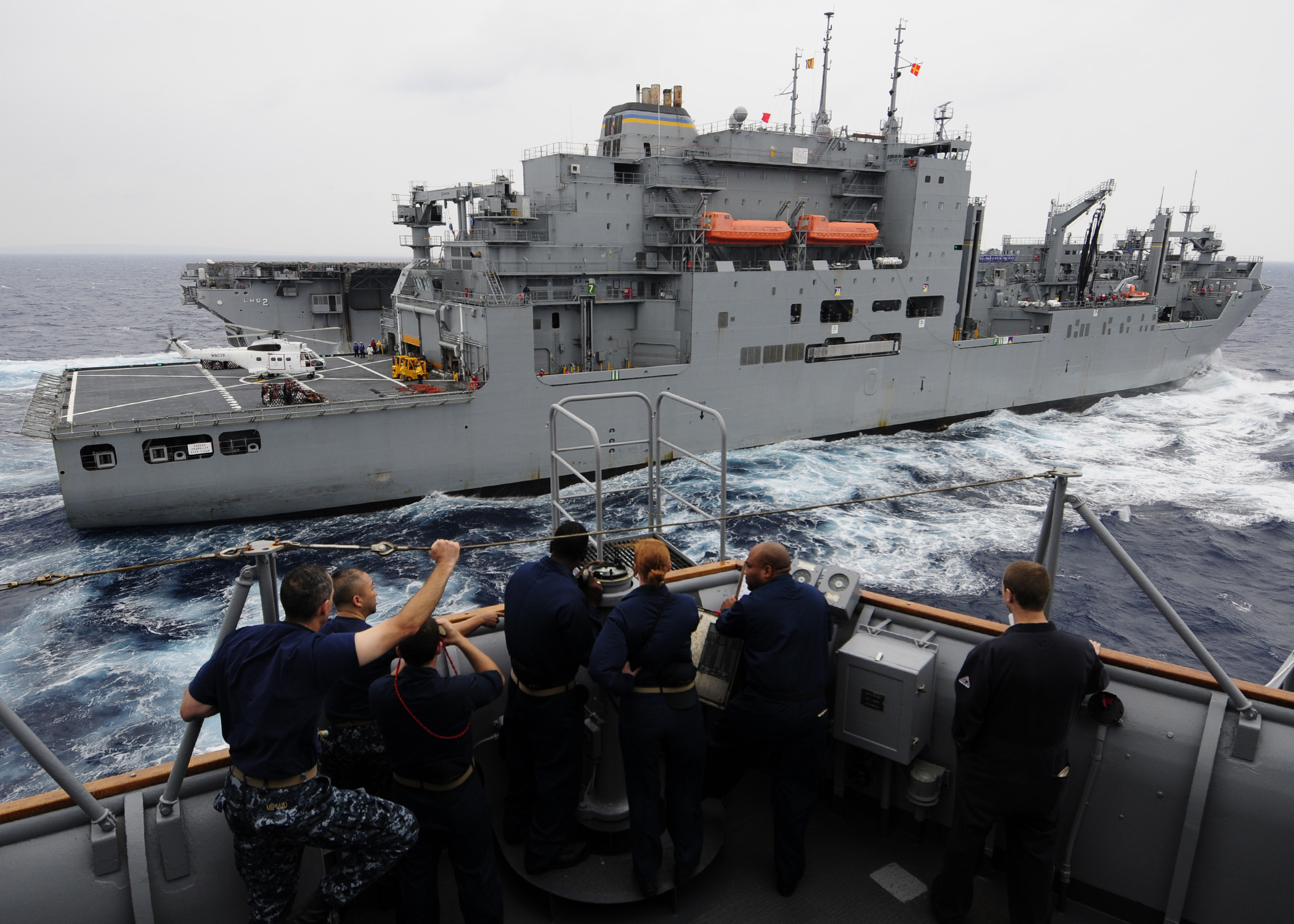 748k | Sailors assigned to the forward-deployed amphibious transport dock shipUSS Denver (LPD-9) look on as Denver pulls alongside USNS Matthew Perry (T-AKE-9) before a replenishment at sea. Denver is part of the Essex Amphibious Ready Group and is conducting operations in the western Pacific region. US Navy photo # 111003-N-WJ771-033 EAST CHINA SEA (Oct. 3, 2011) by MC2 Casey H. Kyhl. |