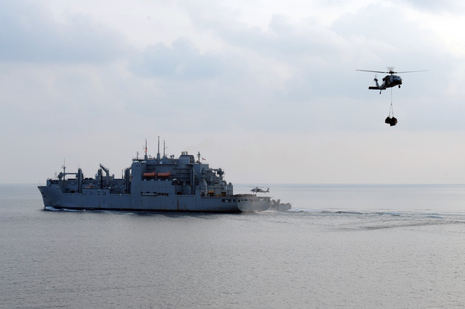 141k | An MH-60S Sea Hawk helicopter from the Eightballers of Helicopter Sea Combat Squadron (HSC) 8 transports cargo during a replenishment-at-sea from USNS Matthew Perry (T-AKE-9) to the flight deck of the aircraft carrier USS John C. Stennis (CVN-74). The John C. Stennis Carrier Strike Group is deployed to the US 7th Fleet area of responsibility conducting maritime security operations and theater security cooperation efforts. US Navy photo # 130330-N-QI595-062 U.S. 7TH FLEET AREA OF RESPONSIBILITY (March 30, 2013) by MCSN Marco Villasana. |