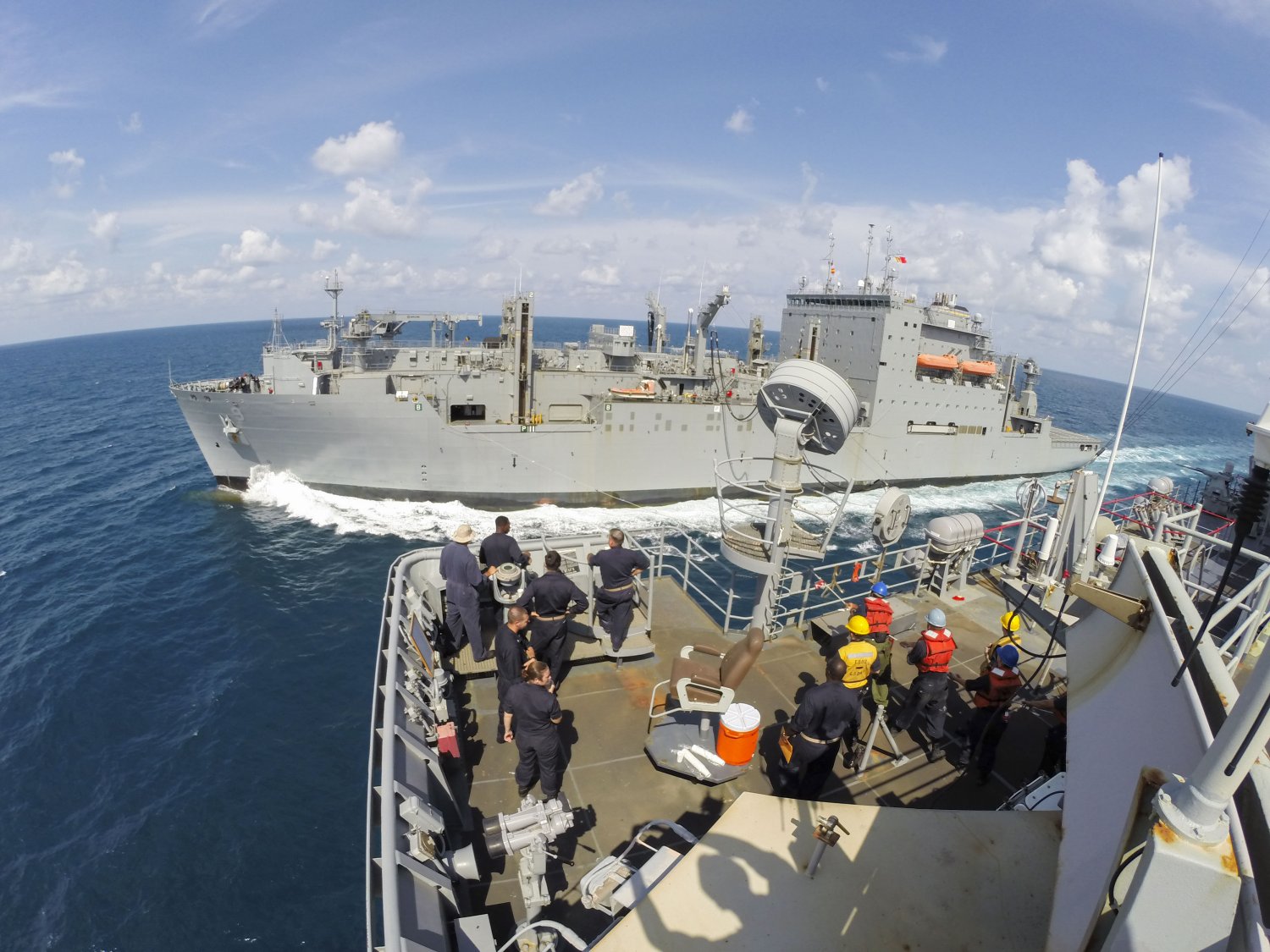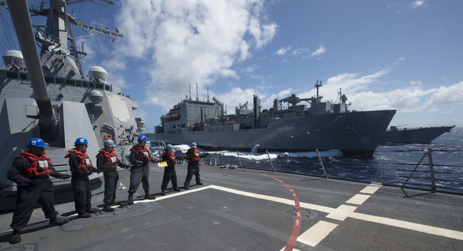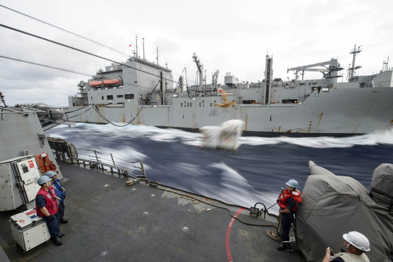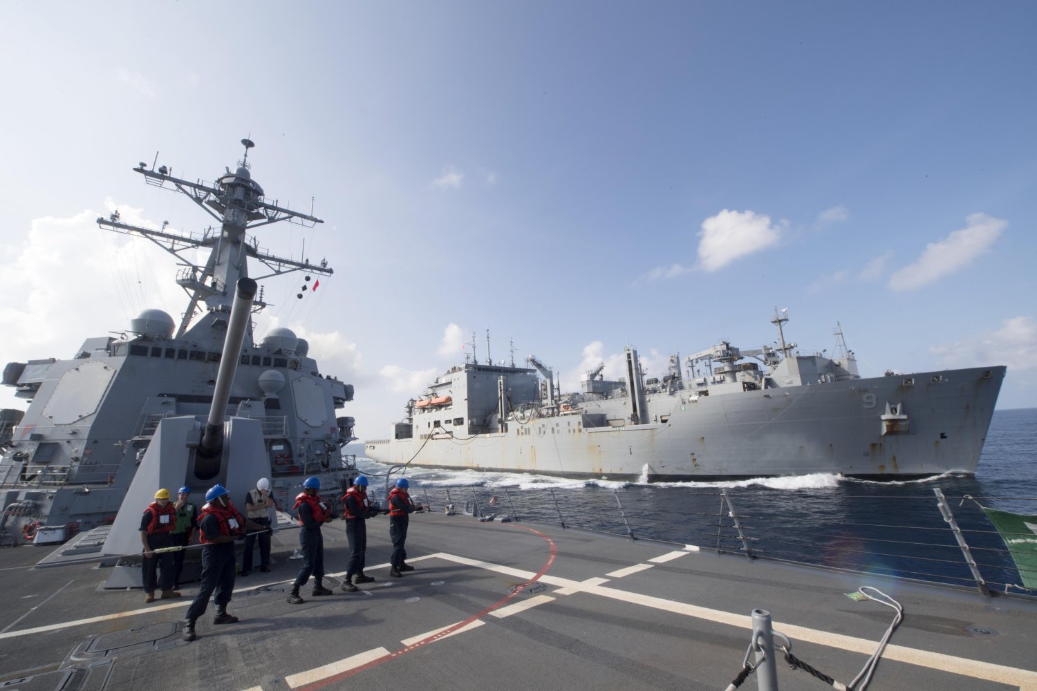 211k | Sailors line handling during fueling-at-sea evolution aboard the Arleigh Burke-class guided-missile destroyer