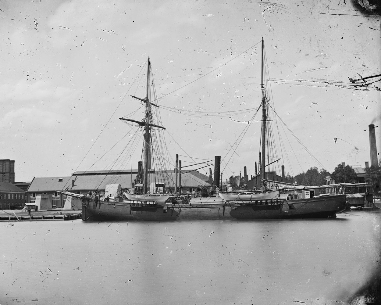 221k | Hall Scientific Expedition research vessel Polaris moored at Washington Navy Yard. She was renamed Polaris in 1871 and made the first expedition to the North Pole. Library of Congress photo. |