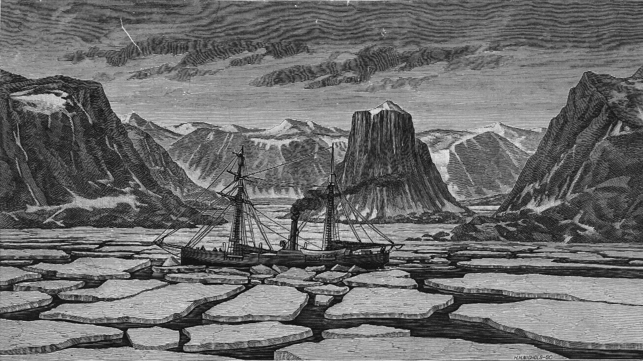 480k | An engraving of Polaris entitled "Passing Fitz Clarence Rock, Aug. 26, 1871" by the artist Henry Hobart Nichols Sr. (1816–1886).