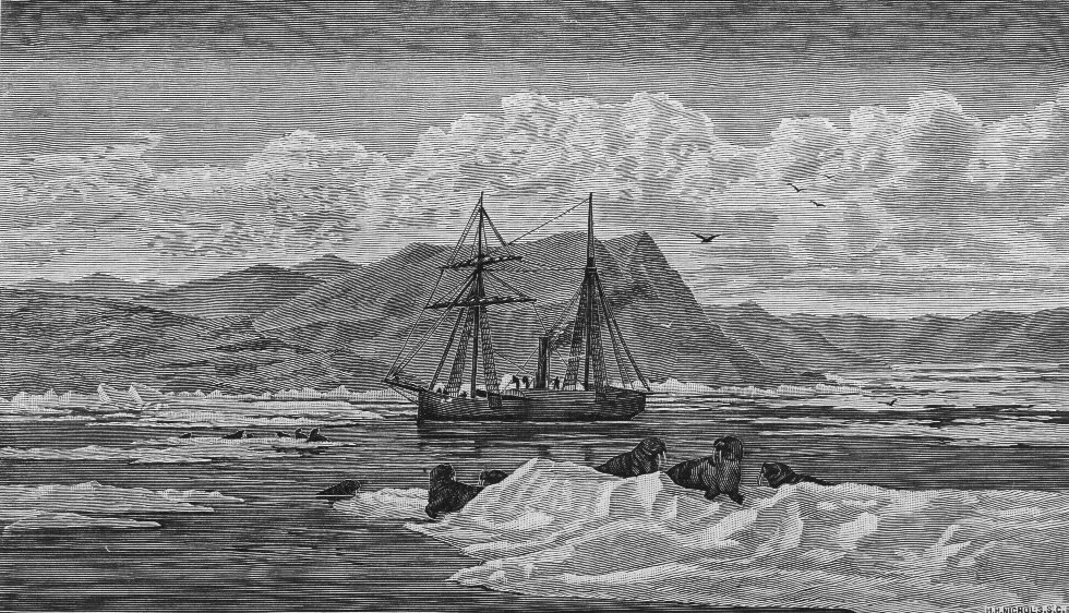 266k | Polaris amidst ice floes. Engraving entitled "Shooting Walrus, Aug. 26, 1871" by the artist Henry Hobart Nichols Sr. (1816–1886).