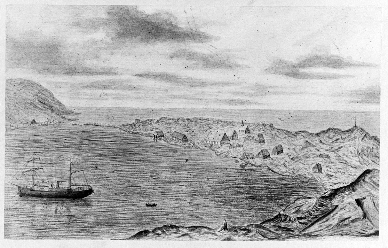 272k | A print of Polaris at Godhaven, Greenland, awaiting the USS Congress on 10 August 1871. Captain Charles F. Hall's Arctic expedition sailed