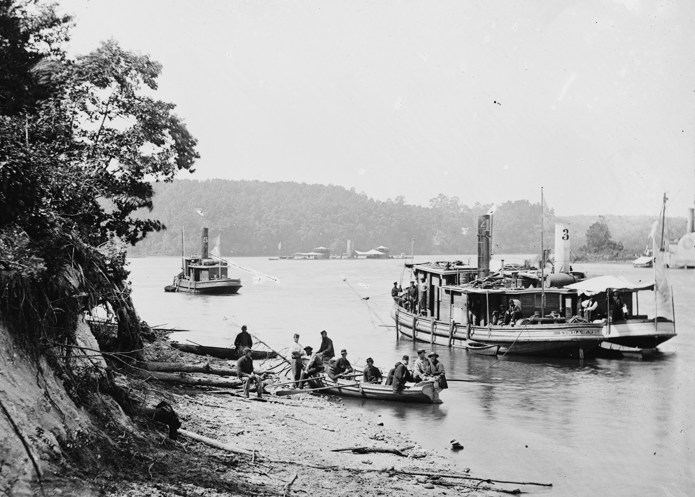 Note the number 4 on her stack. She is in company with Gamma Tugs No.3 and Epsilon Tug No. 5, a sidewheel steamer and possibly the river monitor USS Onondaga. This photograph was probably taken on the James River near Aiken's Landing. Library of Congress photo 01767u |
