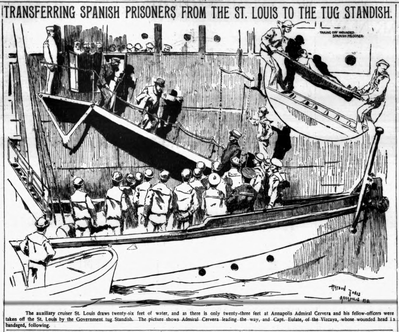 398k | Drawing depicting the transferring of the prisoners-of-war Admiral Pascual Cervera and his officers from USS St. Louis to Standish at Annapolis during the Spanish-American War, 17 July 1898. Image by Haydon Jones, from The World (New York), 18 July 1898. | Robert Hurst | |