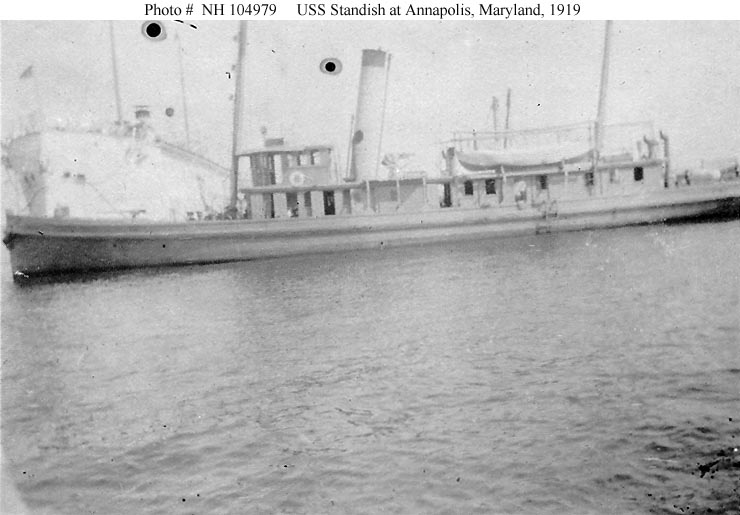 109k | Standish moored pierside at New York Navy Yard, 14 April 1906. She served at the Naval Academy between 1880 and 1919 and was probably at New York for maintenance. US Naval History and Heritage Command, Photo No. NH 43687. |