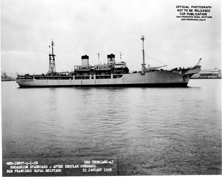 74k | USS Thor (ARC-4) underway off Hunters Point Naval Shipyard, after regular overhaul, 23 January 1958.