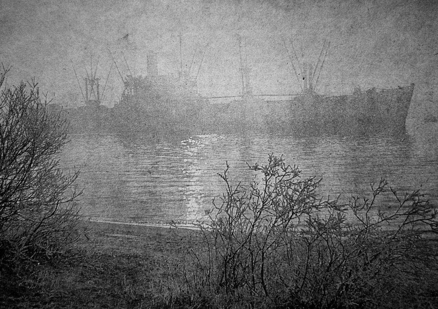 Newspaper photo of ex-USS Suffolk (AKA-69) in merchant service as the United States Lines SS American Retailer making her way down the Weser River in Bremen-Blumenthal, Germany in thick fog during winter 1962. |