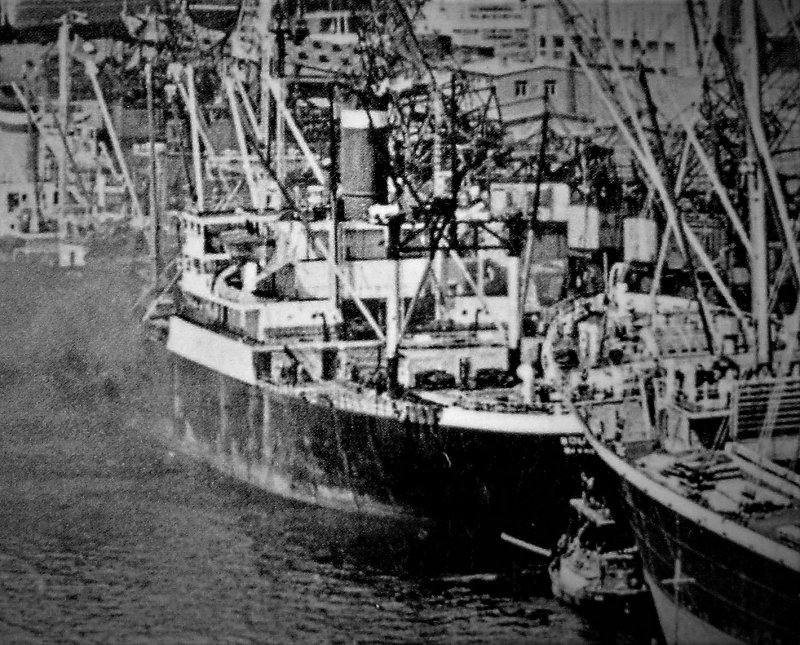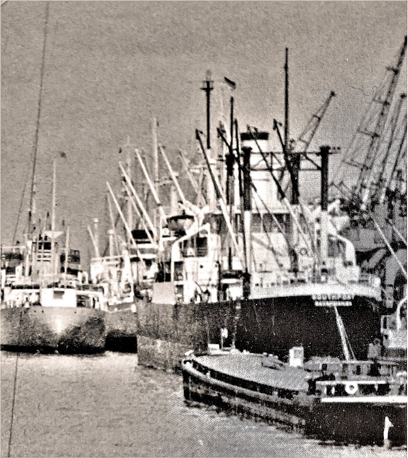 Ex-USS Suffolk (AKA-69) in merchant service as The South Atlantic Steamship company's SS Southport moored pierside at Antwerp, Belgium, circa late-1950s, Note she is in United States Lines colors. |