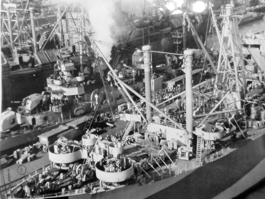 181k | USS Suffolk (AKA-69) during avaiability at Pier 6, Bethlehem Steel Ship Yard, San Francisco, CA. between 2 and 9 January 1945.