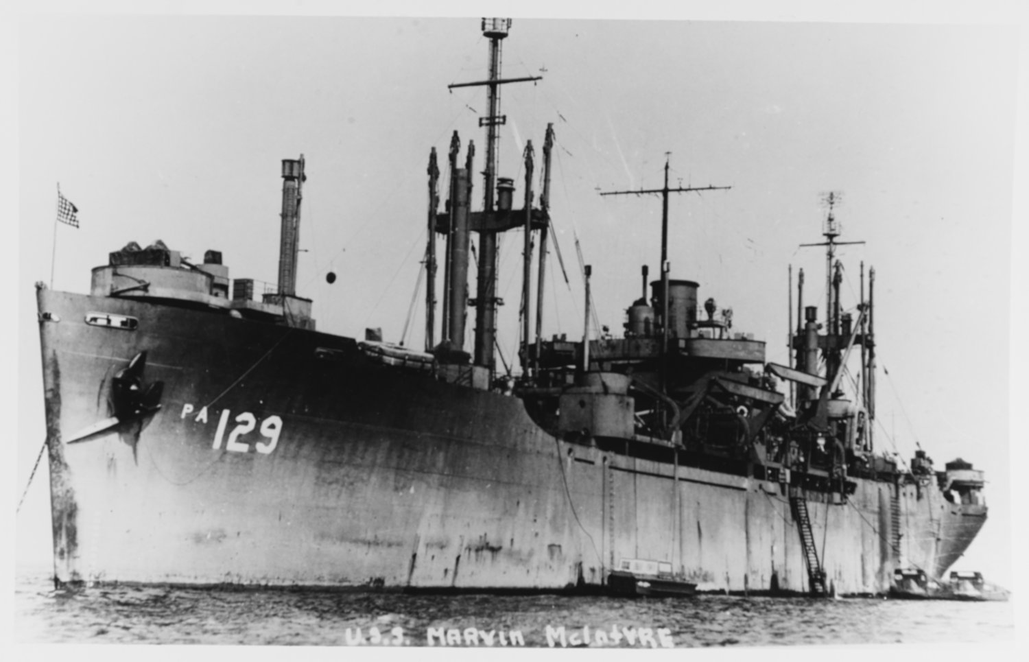134k | USS Marvin H. McIntyre (APA-129) at anchor, circa 1945, location unknown. US Naval History and Heritage Command Photo # NH 74301. Courtesy of Donald M. McPherson, 1971. |