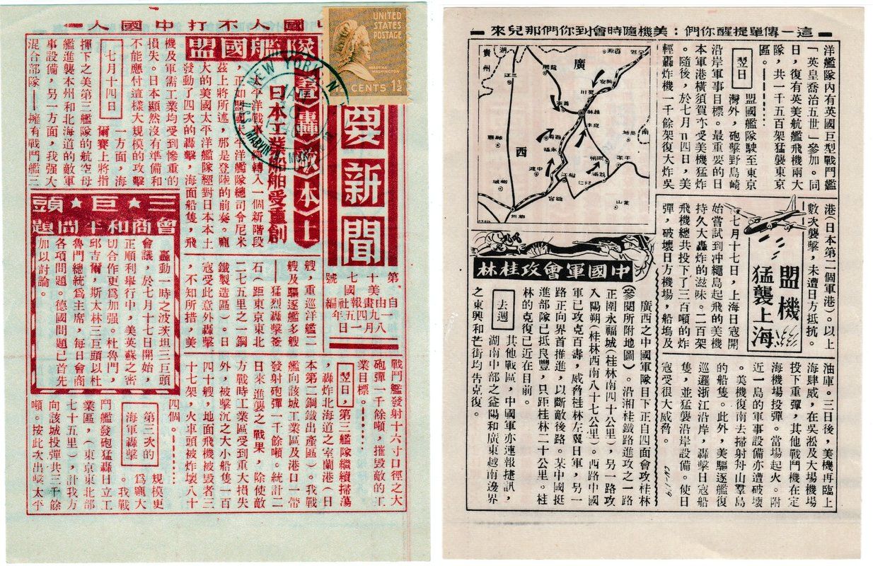 This leaflet states that the Military clique started the war and now want the civilians to finish it. The official title of the leaflet is “A Candle in the Wind,” a Japanese saying that implies an extremely difficult situation. A Japanese family is digging a foxhole to protect themselves from an approaching storm. Paulownia leaves (an ill omen) are seen swirling about. Some of the text reads: "No longer able to conceal their successive defeats, the military is attempting to put the responsibility for defense on the shoulders of the people by ordering them to fortify their homes. They call upon the people to do what the Army, Navy and Air Force are unable to do. How can civilians perform a task that was too great for the trained fighting forces? When the general attack on the homeland begins, there won’t even be a chance to fight against its overwhelming might. The destruction will be terrible and complete. The people cannot save Japan by sacrificing their cities, their homes and their lives. The only hope for Japan’s future lies in unconditional surrender, enabling the people to return to their peacetime pursuits." Theme: Their country is divided. Disunity exists among the army, navy and air forces; between the civil and military population; and between officers and enlisted men. The second set of leaflets has the word "Newspaper" on them and discusses how America and the allied forces are attacking Japan, the Potsdam Conference and what the Chinese army was doing during this time. Courtesy SGM Herbert A. Friedman USA Ret Psywarrior |