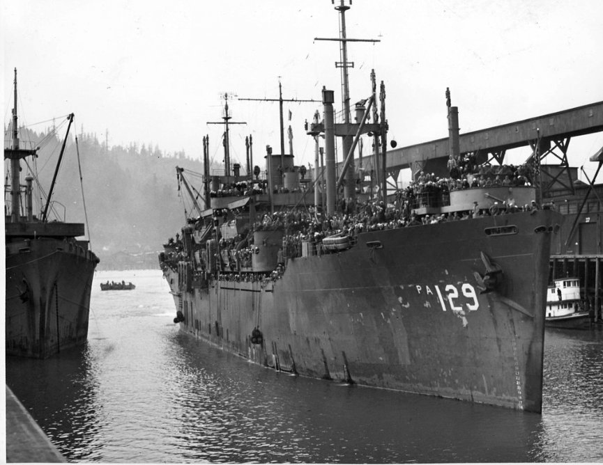 107k | USS Marvin H. McIntyre (APA-129) arriving at Seattle, WA., 21 November 1945, completing a Magic Carpet voyage.