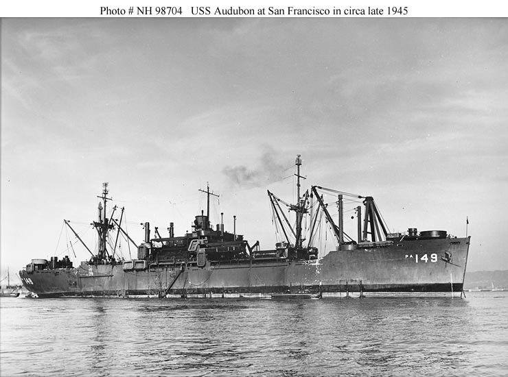 77k | USS Audubon (APA-149) anchored in San Francisco Bay, between October 1945 and January 1946. US Navy photo # NH 98704 donated to the US Naval Historical Center by Boatswain's Mate First Class Robert G. Tippins, USN (Retired), 2003. |